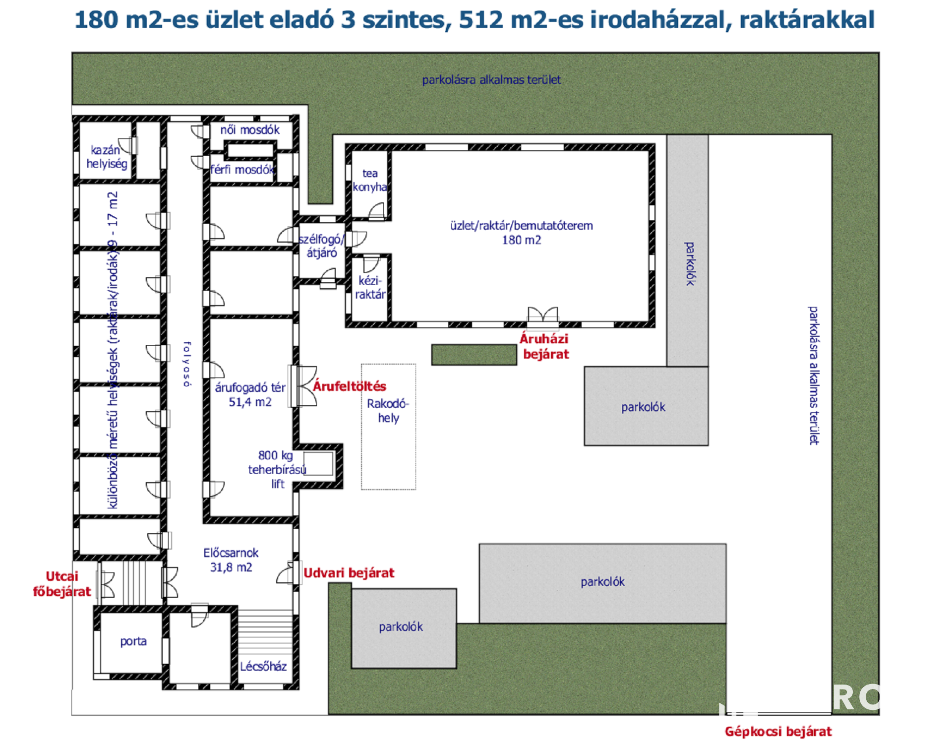 180 m2-es üzlet eladó 3 szintes irodaházzal, raktárakkal