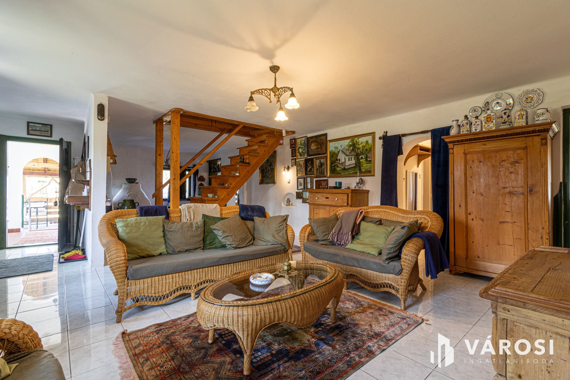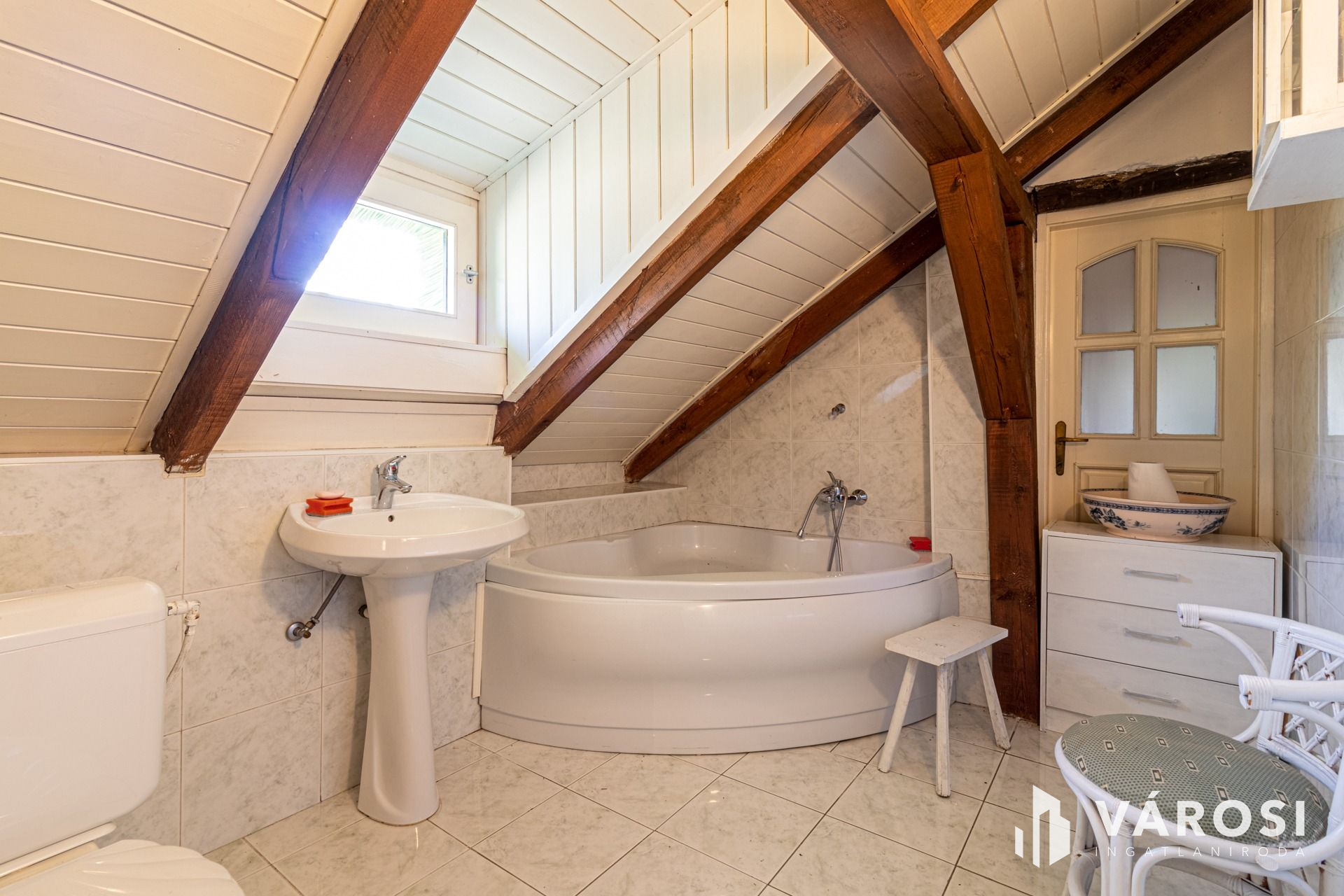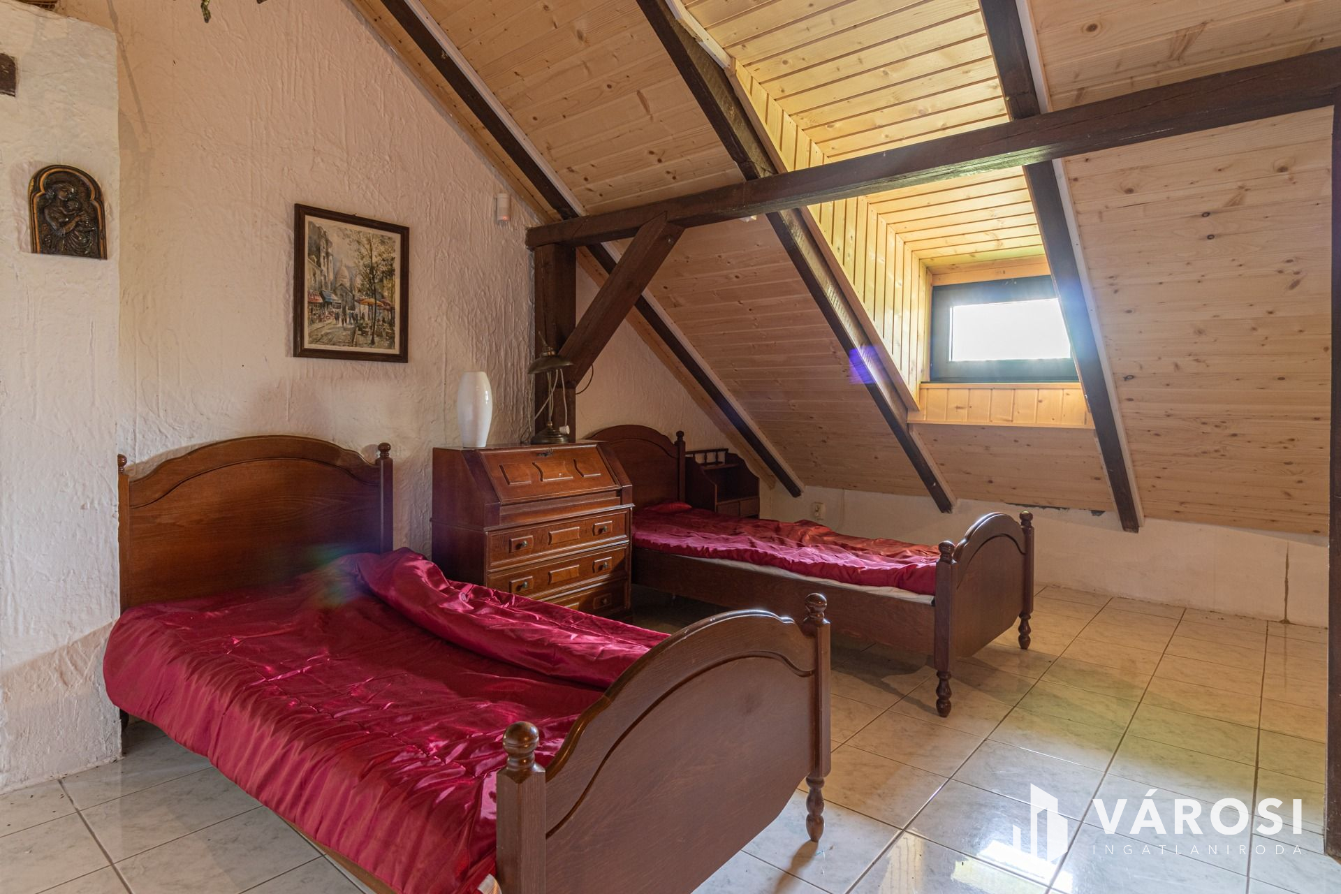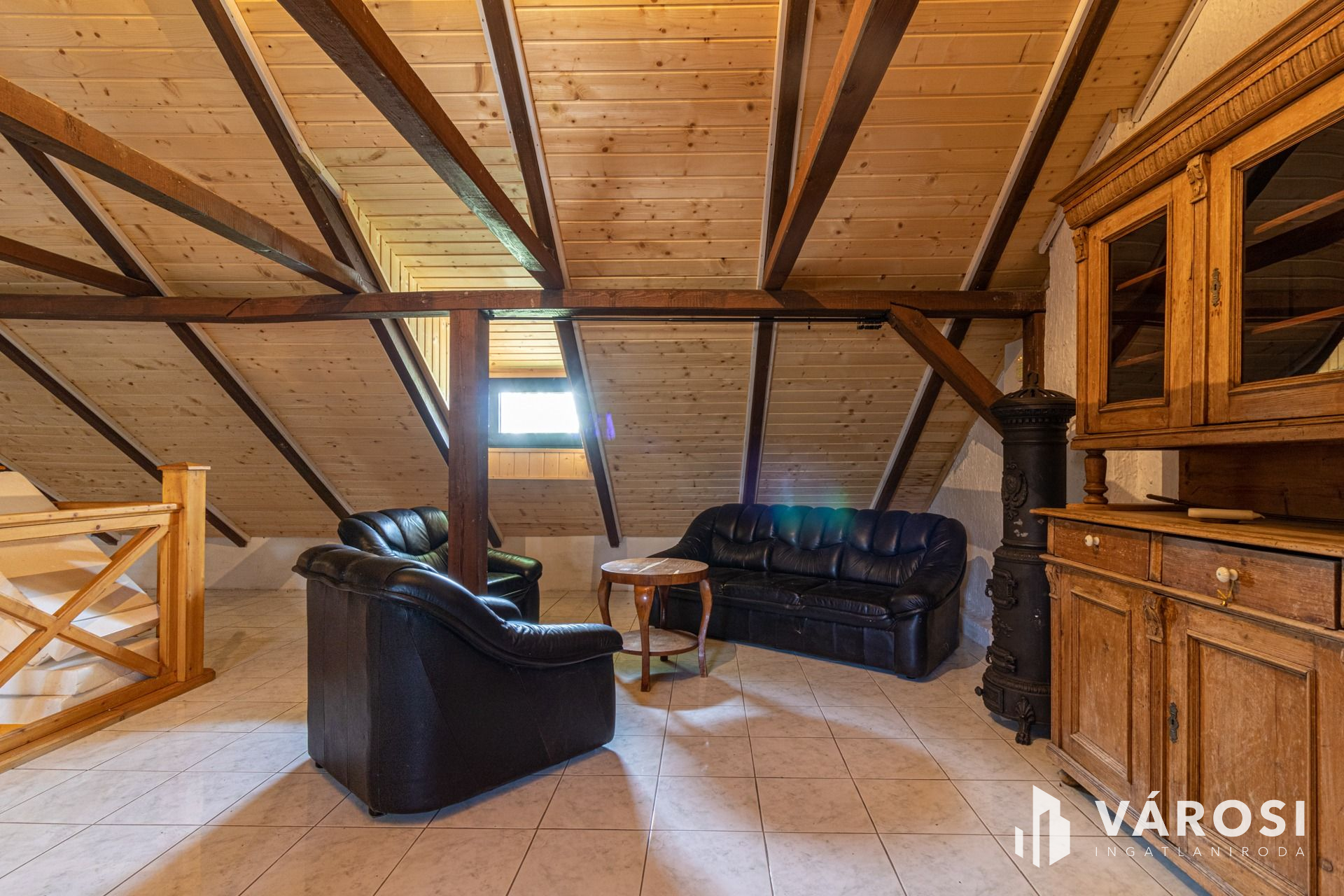A lakóház két szintes, az alsó rész teljesen kész, a tetőtérben csak a fürdőszoba lett kialakítva, a többi terület beépíthető.