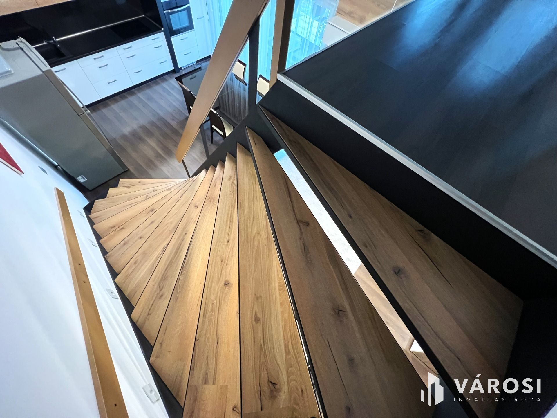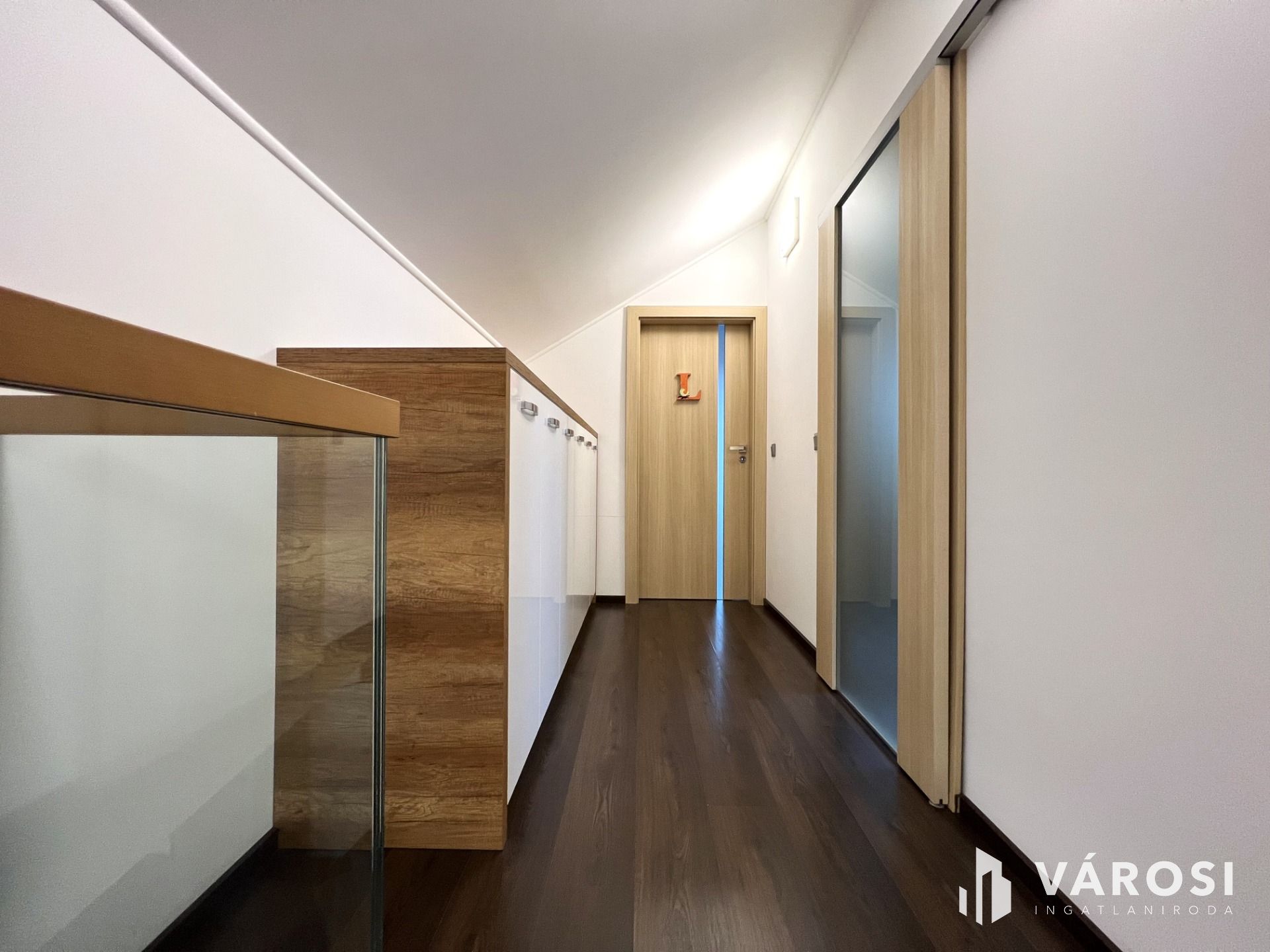 Minden helyiség bútorozott, nagyon szép anyagok, falburkolatok kerültek felhasználásra. A nappaliból az emeletre egy minimál tervezésű modern lépcsőn juthatunk, ahol üveg korlátok teszik még elegánsabbá, légiesebbé a teret.