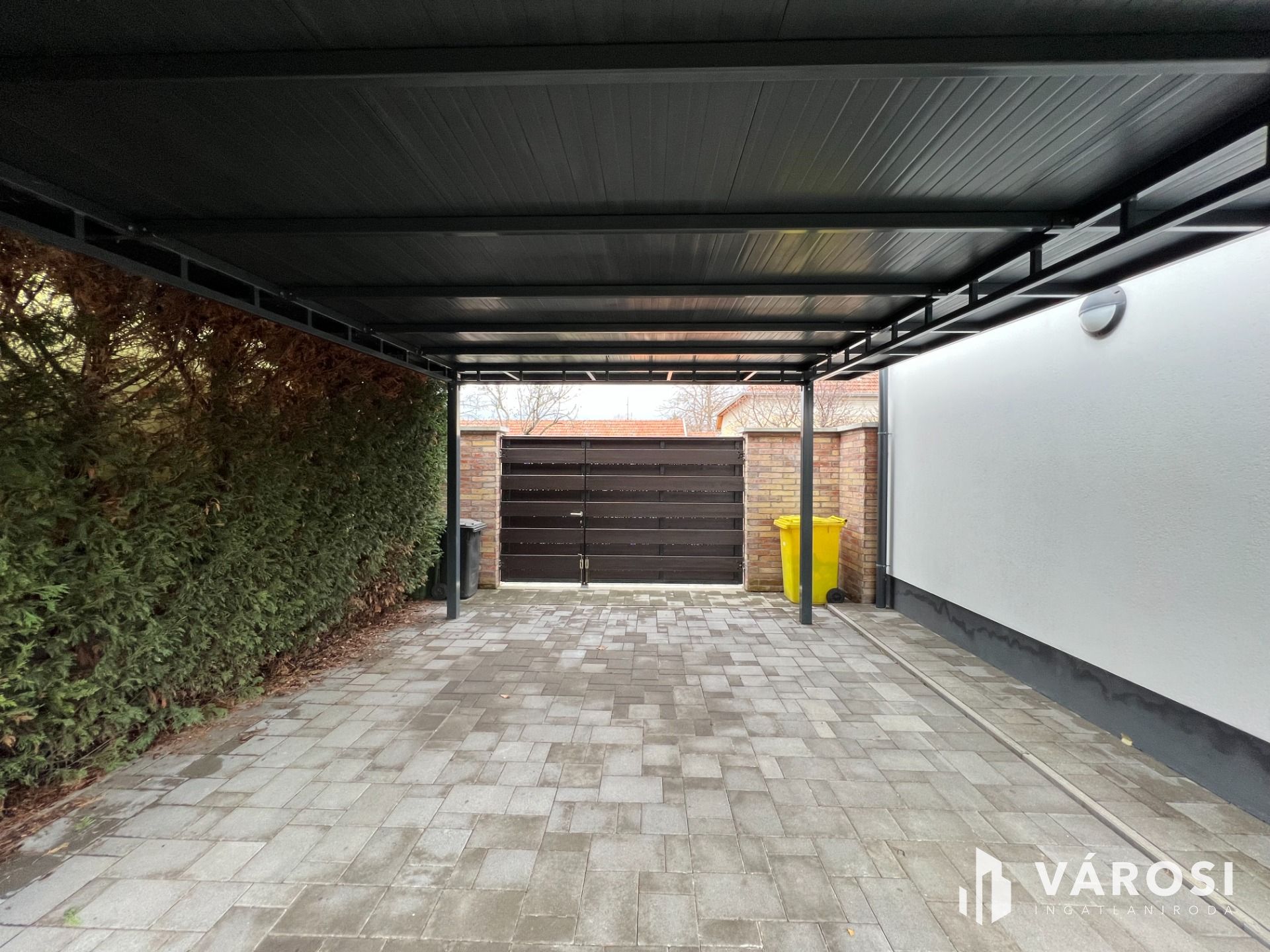 Az udvaron található még egy fedett gépkocsibeálló, és a bejárat, a salgó polcokkal beépített, elektromos garázskapuval felszerelt kényelmes garázsba.