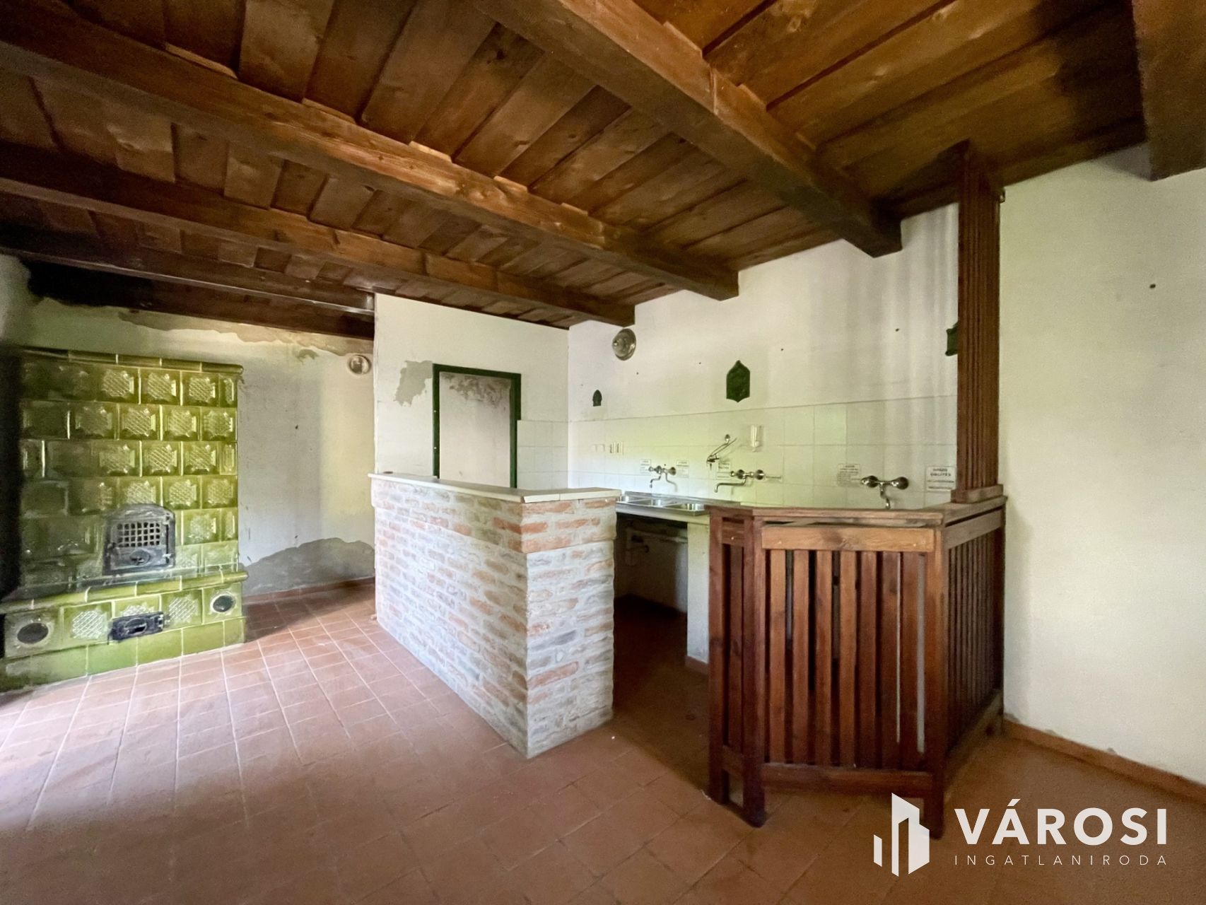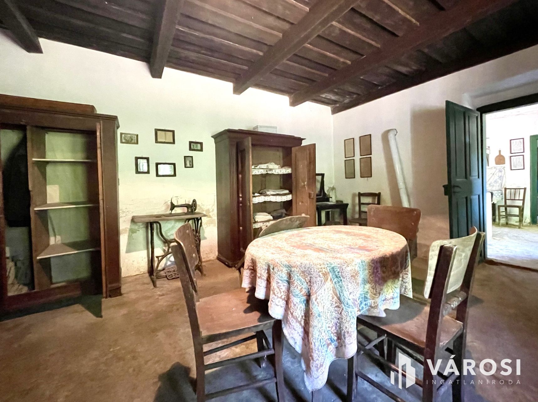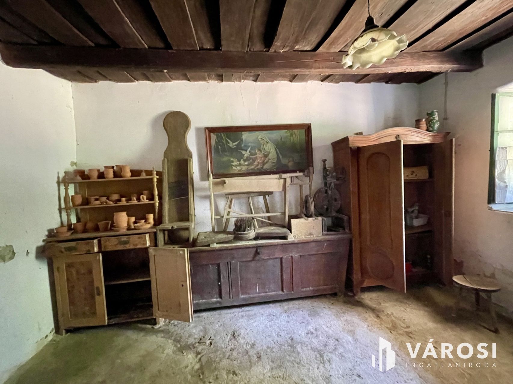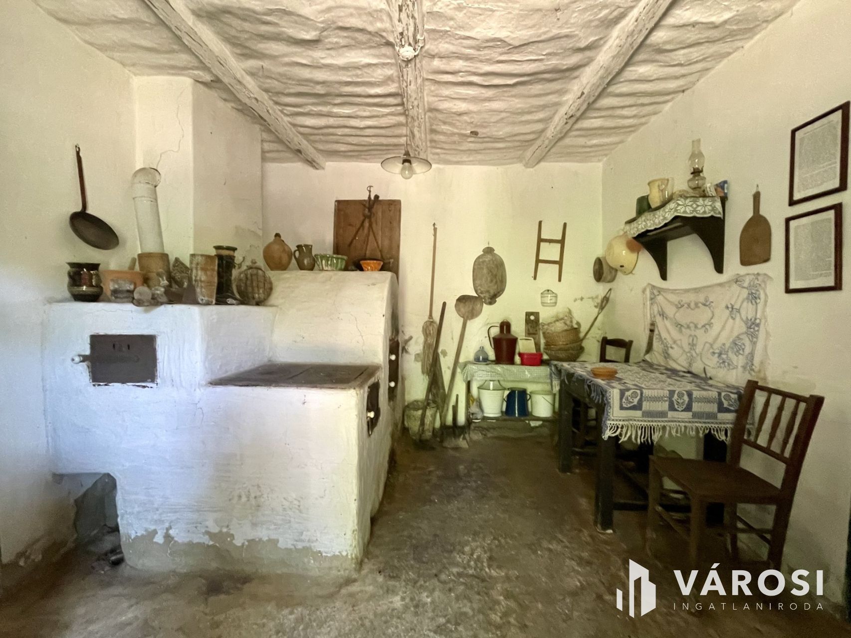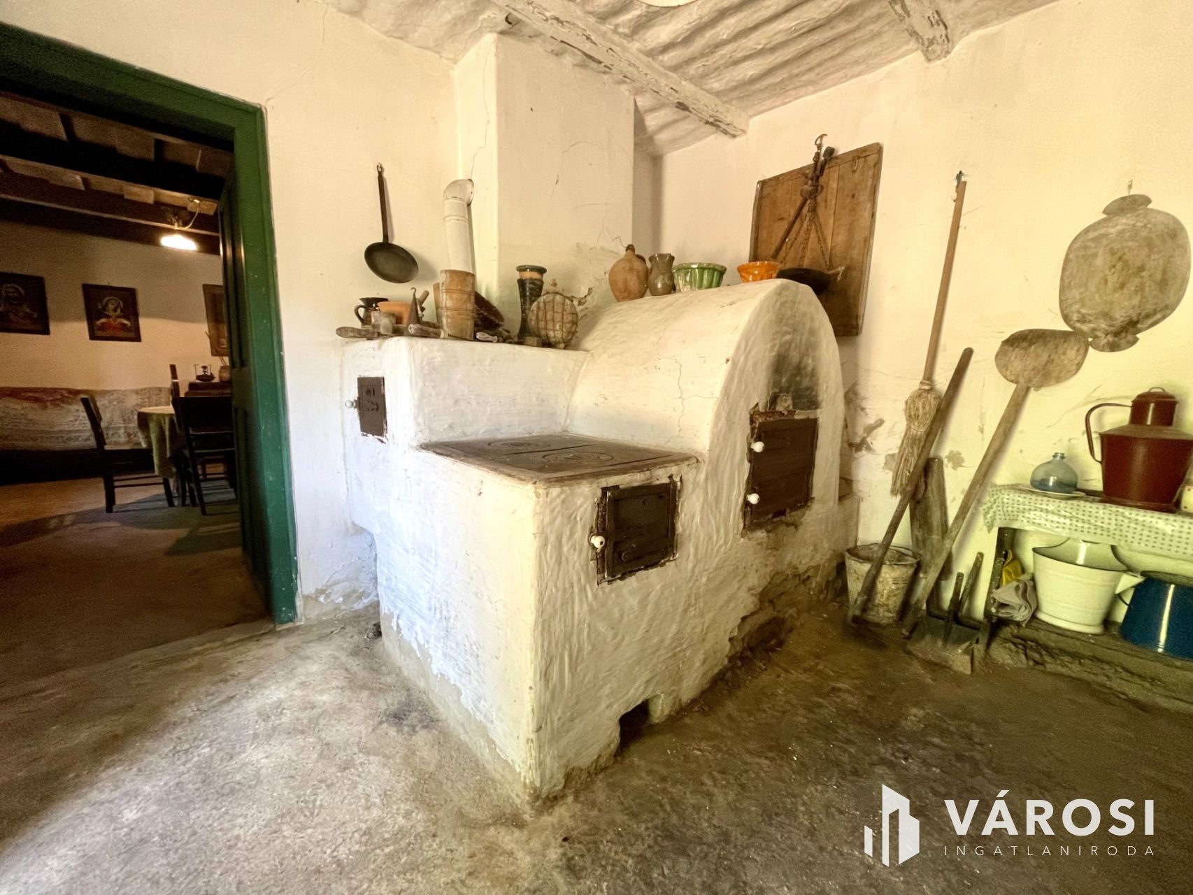 A 68 m²-es nádtetős főépület megőrizte eredeti báját: döngölt padló, gerendás mennyezet, működő épített kemence és vegyestüzelésű kályha teremti meg a múltidéző hangulatot. A két szoba, konyha és kézműves műhely autentikus vidéki miliőt kínál, ahol jelenleg villany van, a víz bevezetése a leendő tulajdonosra vár.