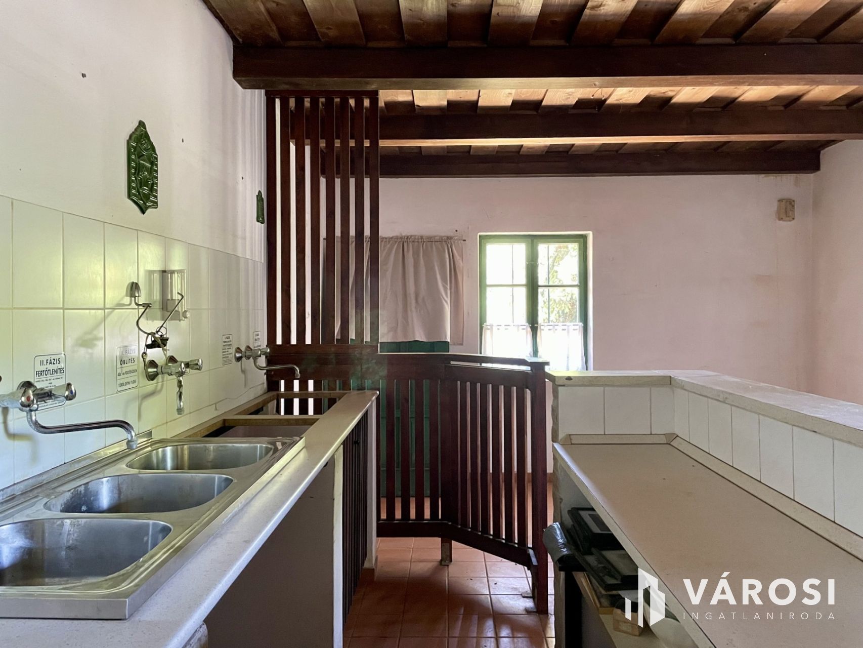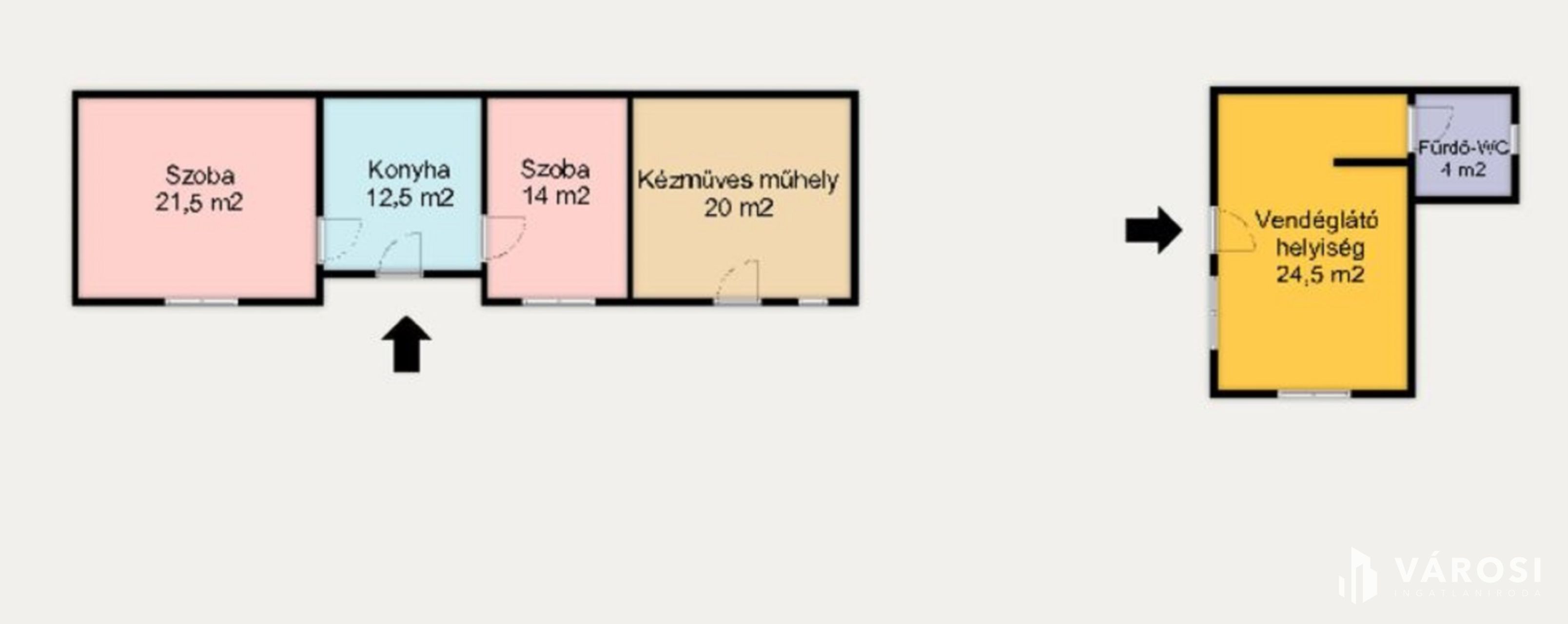 A 28,5 m²-es vendéglátóegység szintén vályogból épült, viszont már vízzel, csatornával, fürdővel és cserépkályhás fűtéssel ellátott, így akár azonnal megnyitható benne egy kis kávézó, bisztró vagy vendégház. Az ingatlan 1751 m2-es telken fekszik.