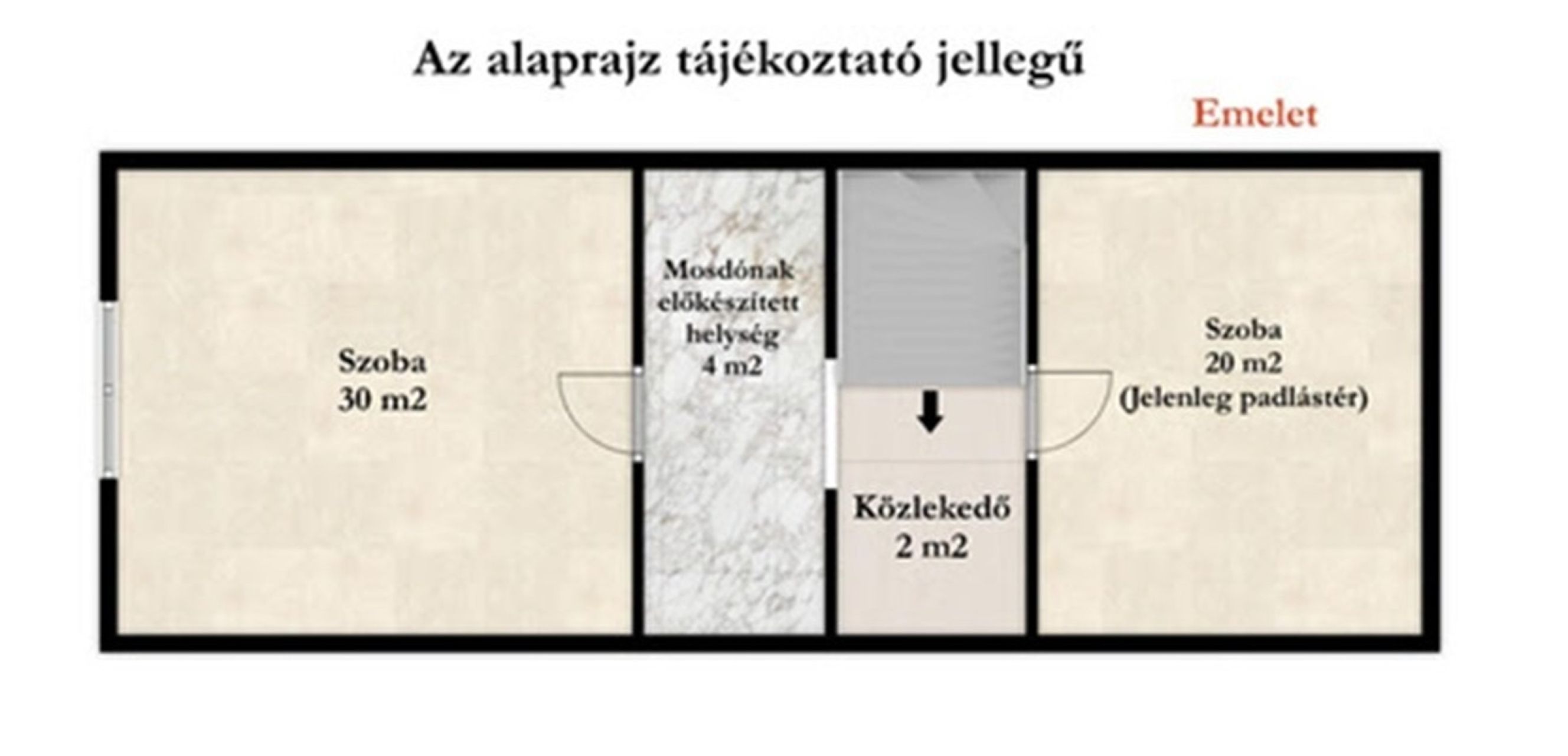 Az emeleti szint jelenleg két részre tagolt. Az egyik oldalon már új ablak került beépítésre, a víz és a szennyvíz felvezetése megtörtént, így itt egy külön szoba és akár egy vizesblokk is könnyedén kialakítható. A másik rész jelenleg padlástérként funkcionál, de adottságai alapján ez is bevonható a lakótérbe. A fűtés jelenleg hűtő-fűtő klímával megoldott, a gázkonvektorok leszerelésre kerültek, de bármikor visszahelyezhetők, a melegvíz villanybojlerrel biztosított.