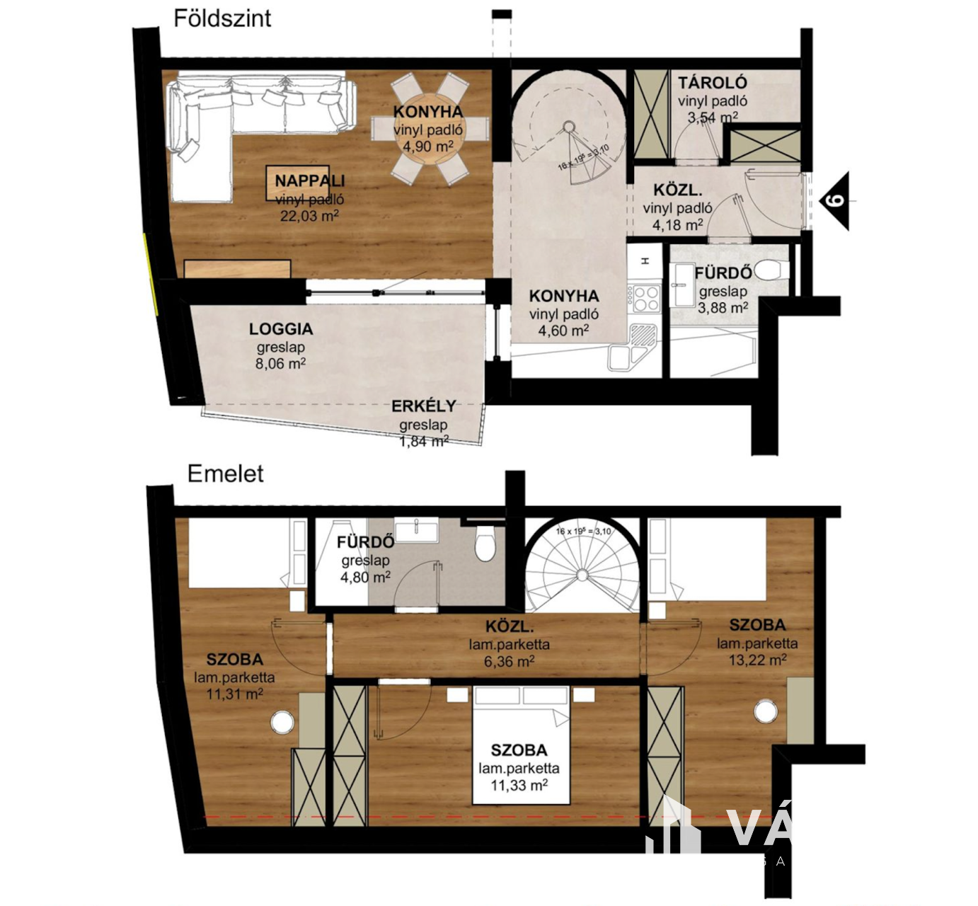 Belső 2 szintes, 4 szobás lakás loggia-val (96 m² + 10 m²)