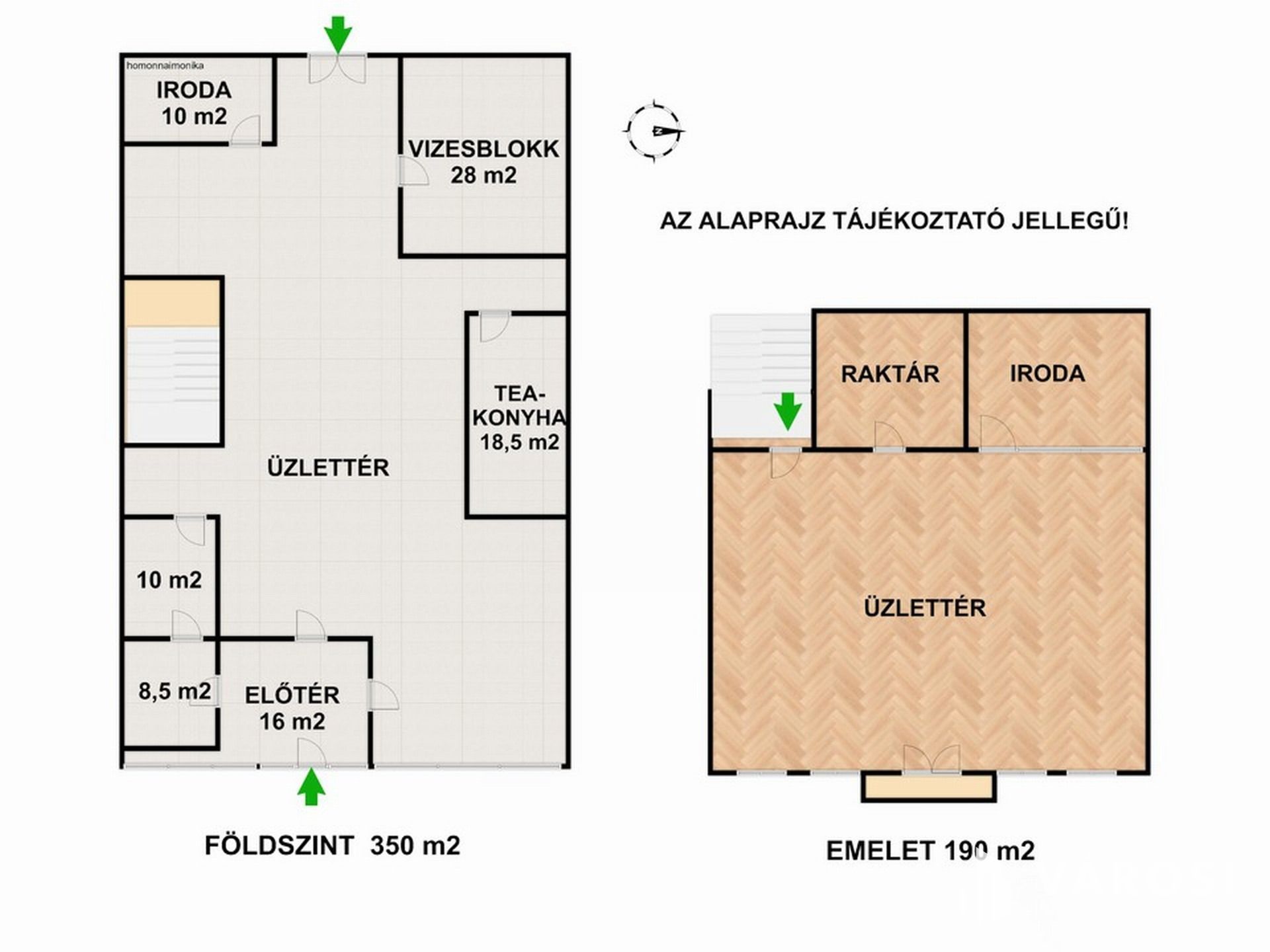 A földszint alapterülete kb. 350 m2, az emelet 190 m2. A két szint akár külön is hasznosítható, külső lécsővel is rendelkezik. A nagy belső tereken kívül kisebb termekre, raktárakra, szociális helyiségekre tagolódik, és akár tovább tagolható, osztható.