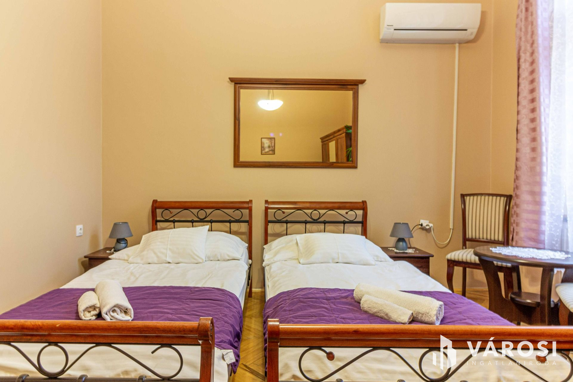 2. apartman: 2 külön nyíló szoba – az egyik szobának saját, szobából nyíló fürdőszobája van – további egy fürdőszoba (zuhanyzó + toalett), közös étkező / konyha