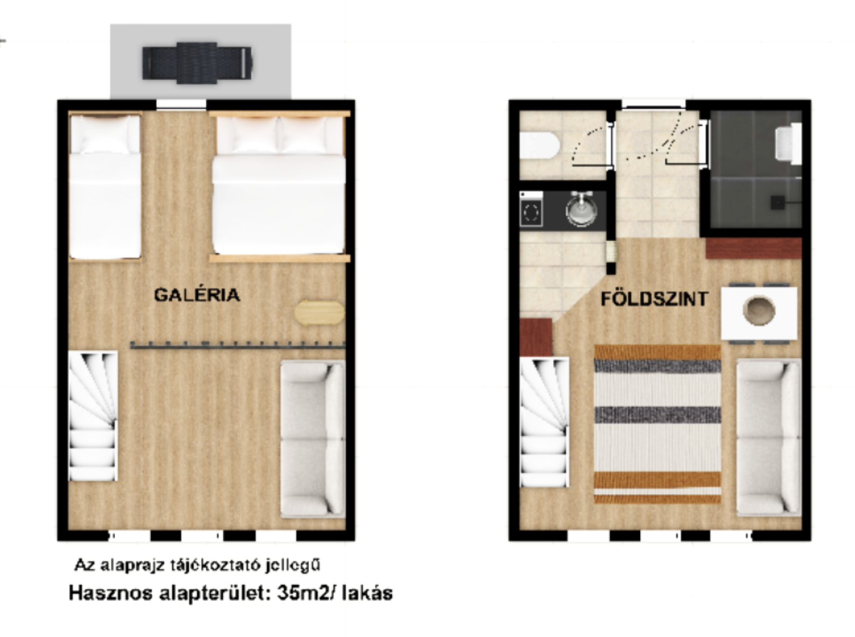 A lakások berendezettek, az alsó szinten étkező asztal székekkel, kinyitható kétszemélyes kanapé, tv, berendezett felszerelt konyha, gardrób szekrények, az emeleten 1 franciaágy és egy egyszemélyes ágy található.