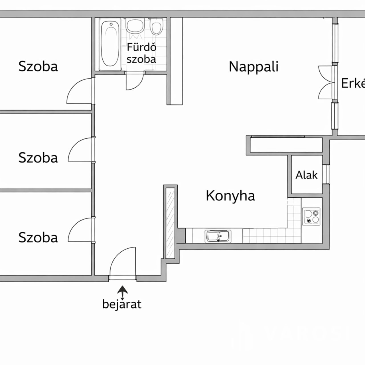 - Elosztása: - tágas nappali, konyha- étkező egy légtérben, erkéllyel,- 3 szoba, - fürdőszoba - WC külön helyiségben,