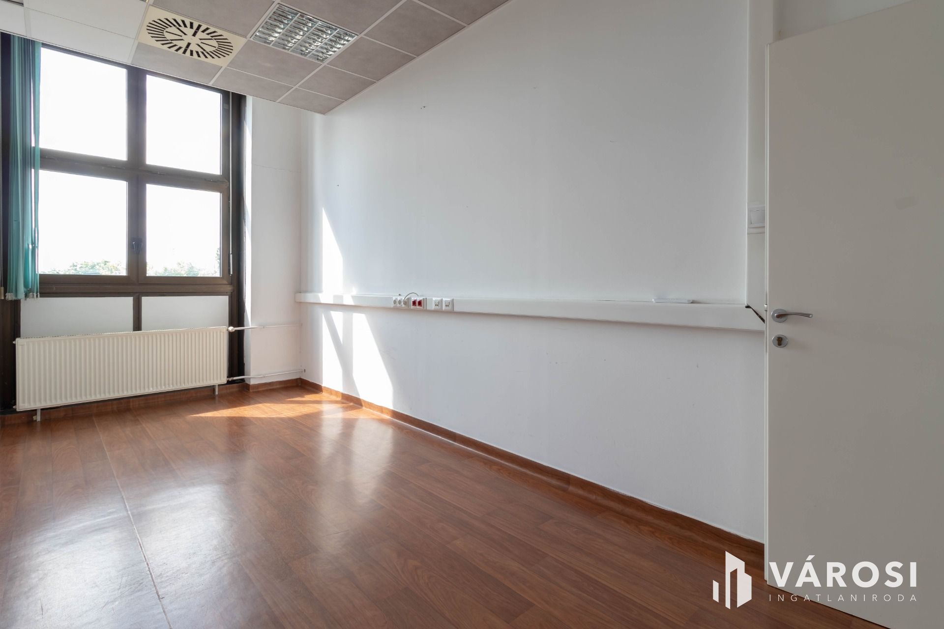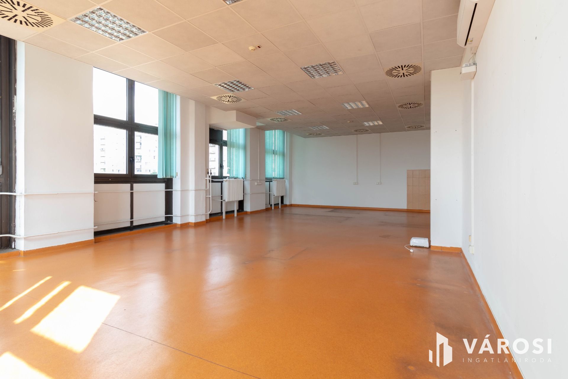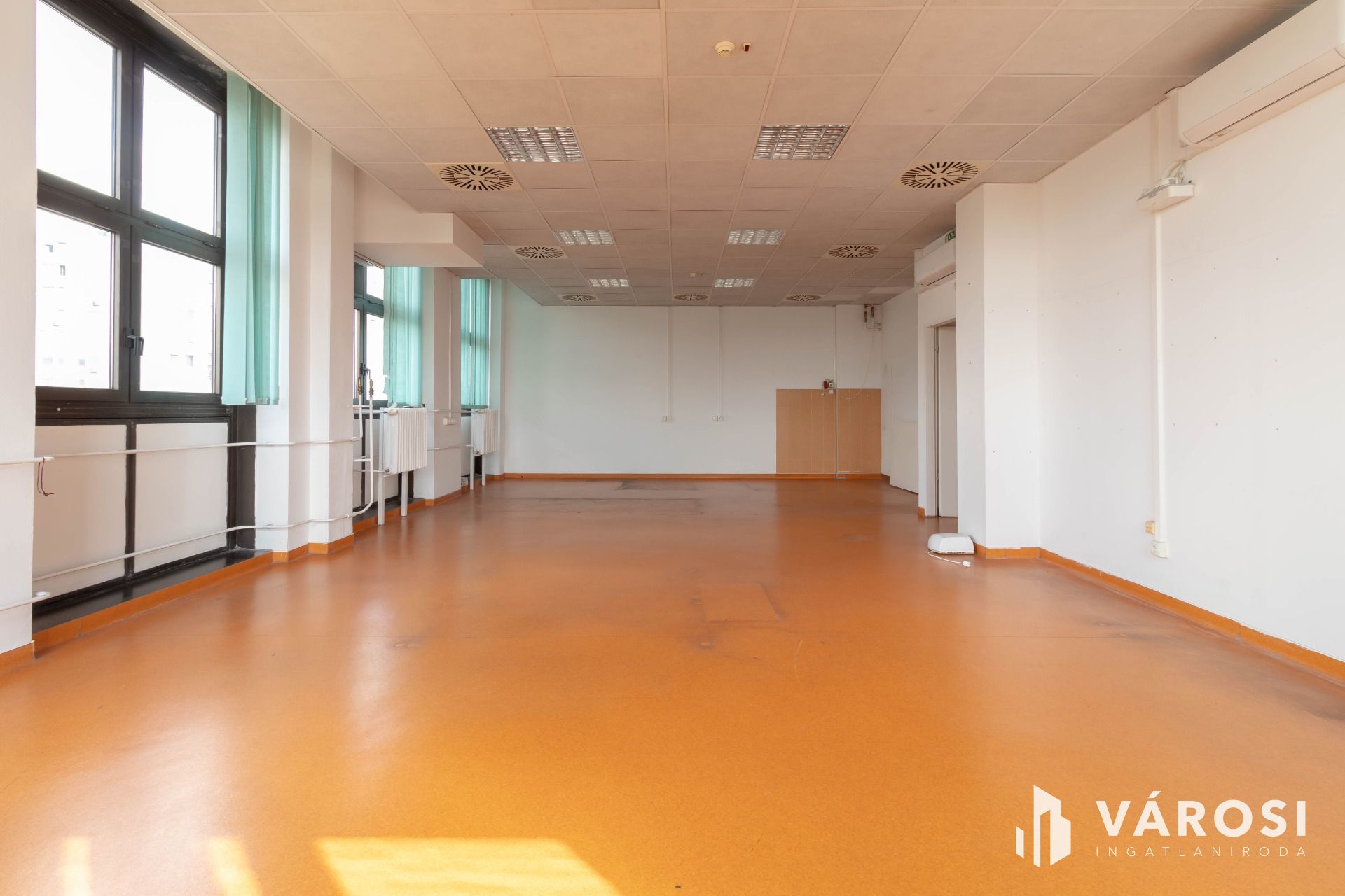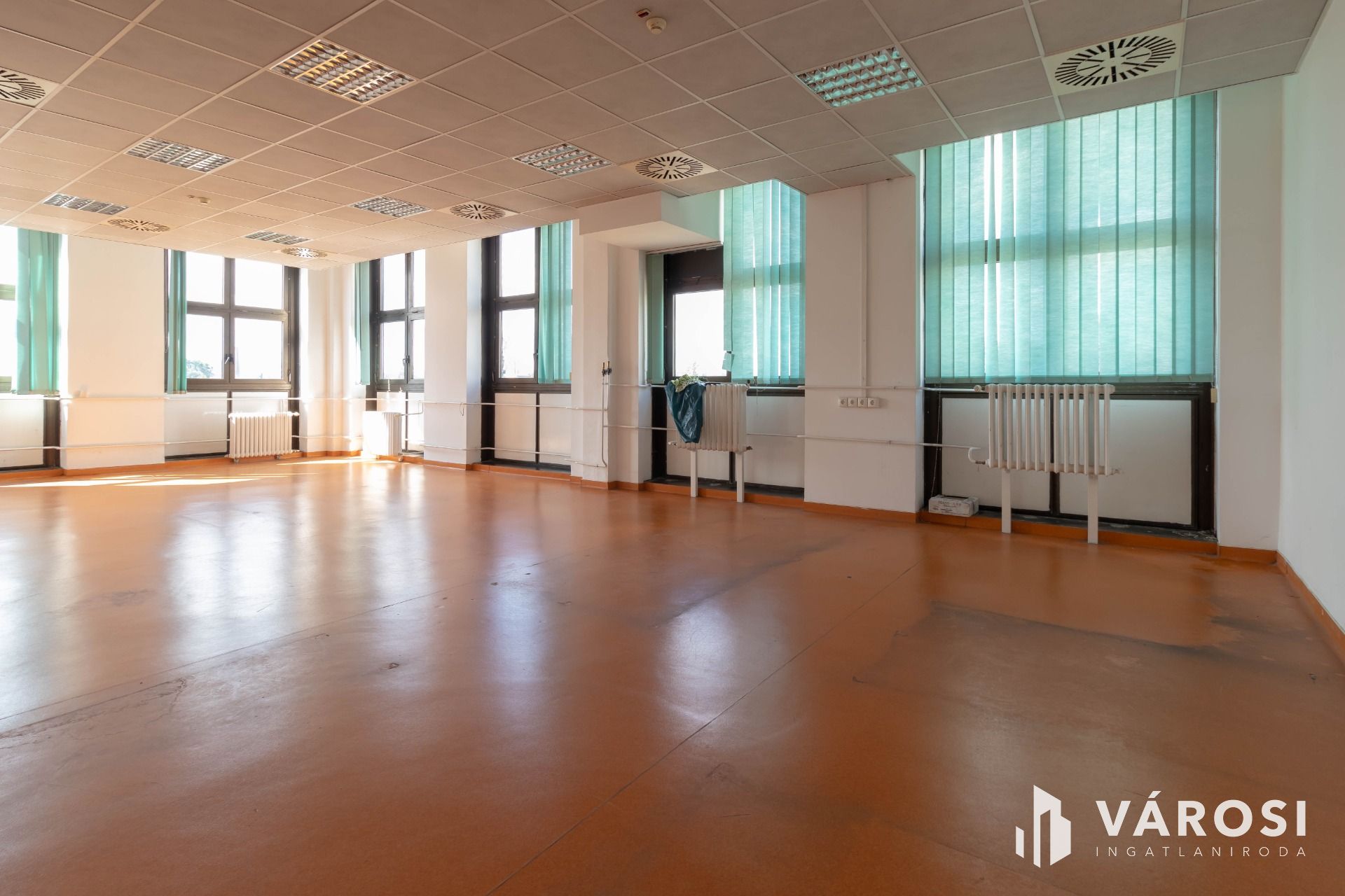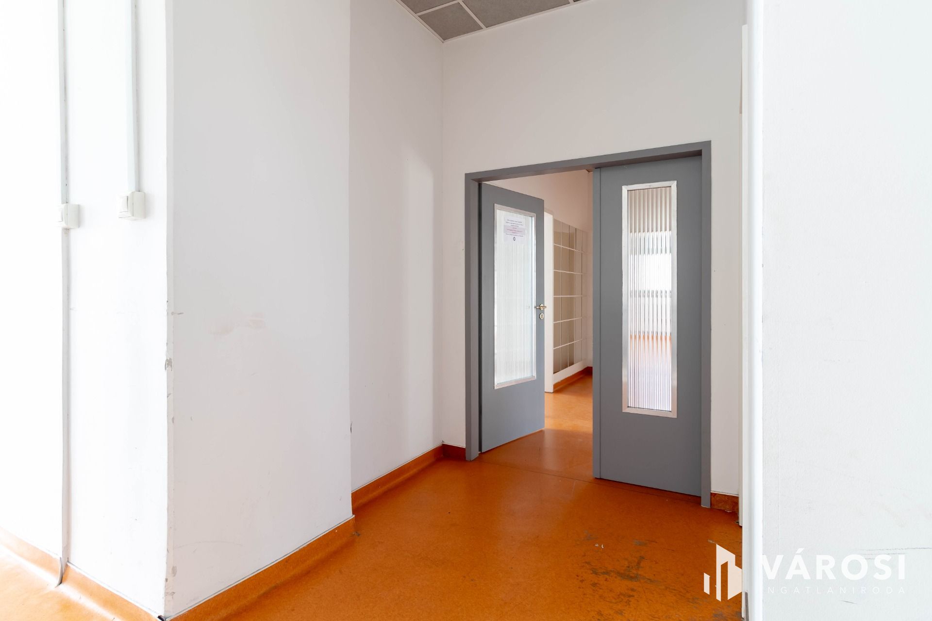 A 2. emeleten található, belső vizesblokkal rendelkező, 132 m2-es ingatlanrészben van egy 77 m2-es nagy terem, valamint két 17 m2-es iroda. A 8 m2-es előtérből nyílik mindegyik, valamint innen nyílik a 7 m2-es konyha is. A konyhából pedig az 5 m2-es mosdó, külön férfi és női wc-vel.