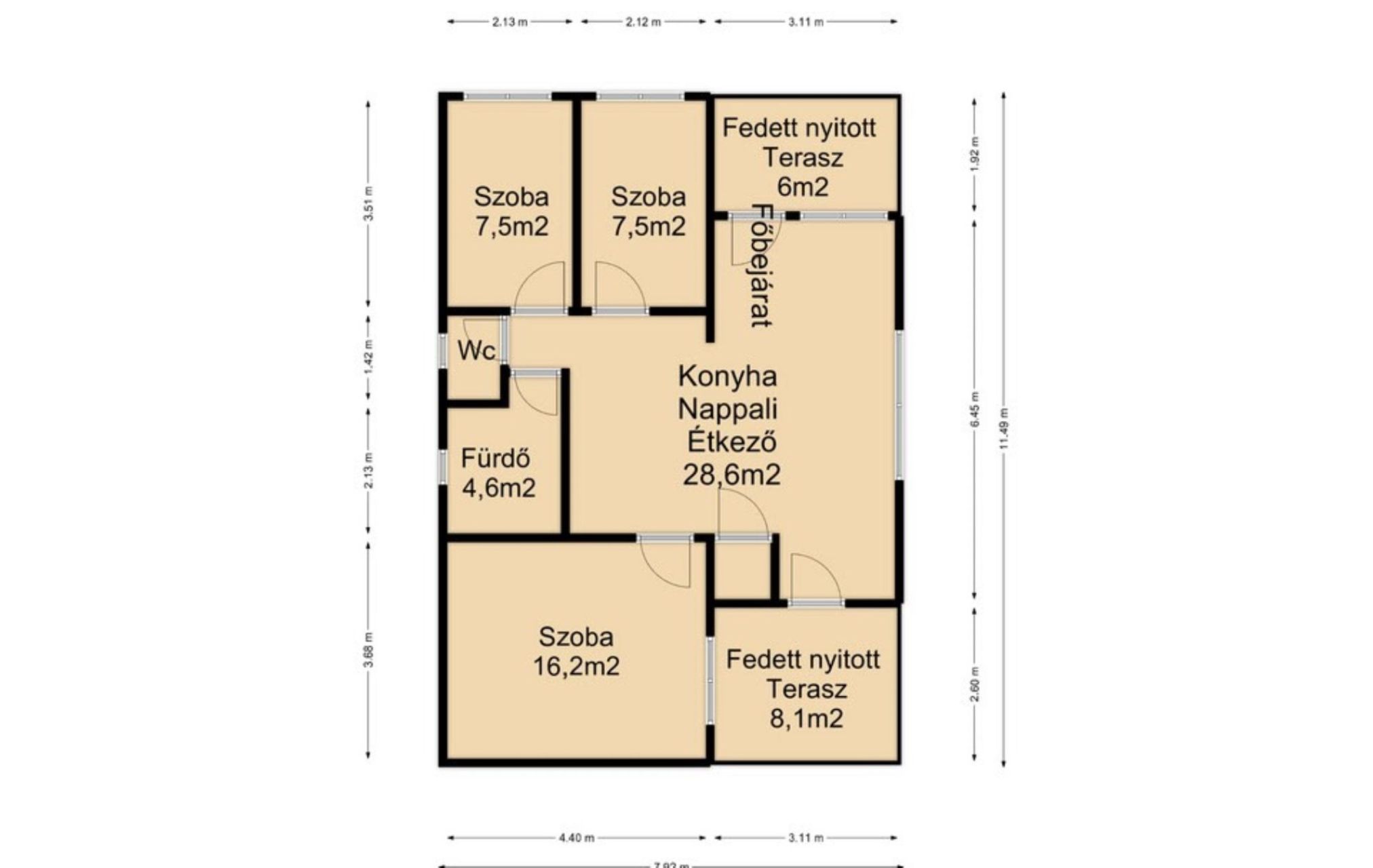 A hirdetésben a 67m2-es alapterület a ház belső mért nettó területe. A teraszok nem kerültek beszámításra. ( 6m2 és 6,2m2)