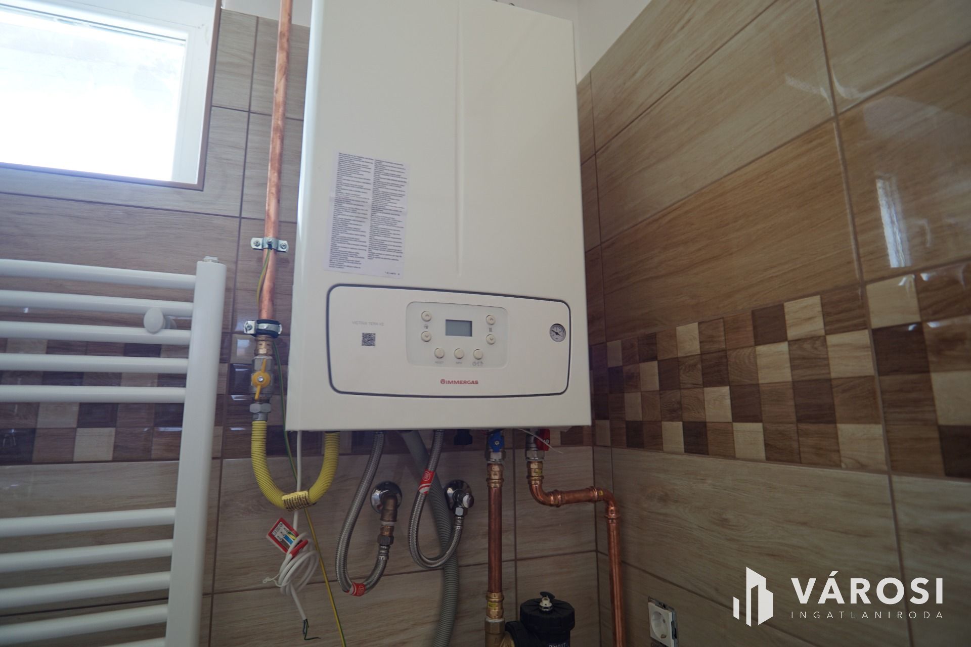 A ház melegét egyedi kombi, kondenzációs gáz cirkó kazán biztosítja, padlófűtés és radiátorok segítségével. A nyári napok lehűtésében klíma segédkezik. (hűtő-fűtő)