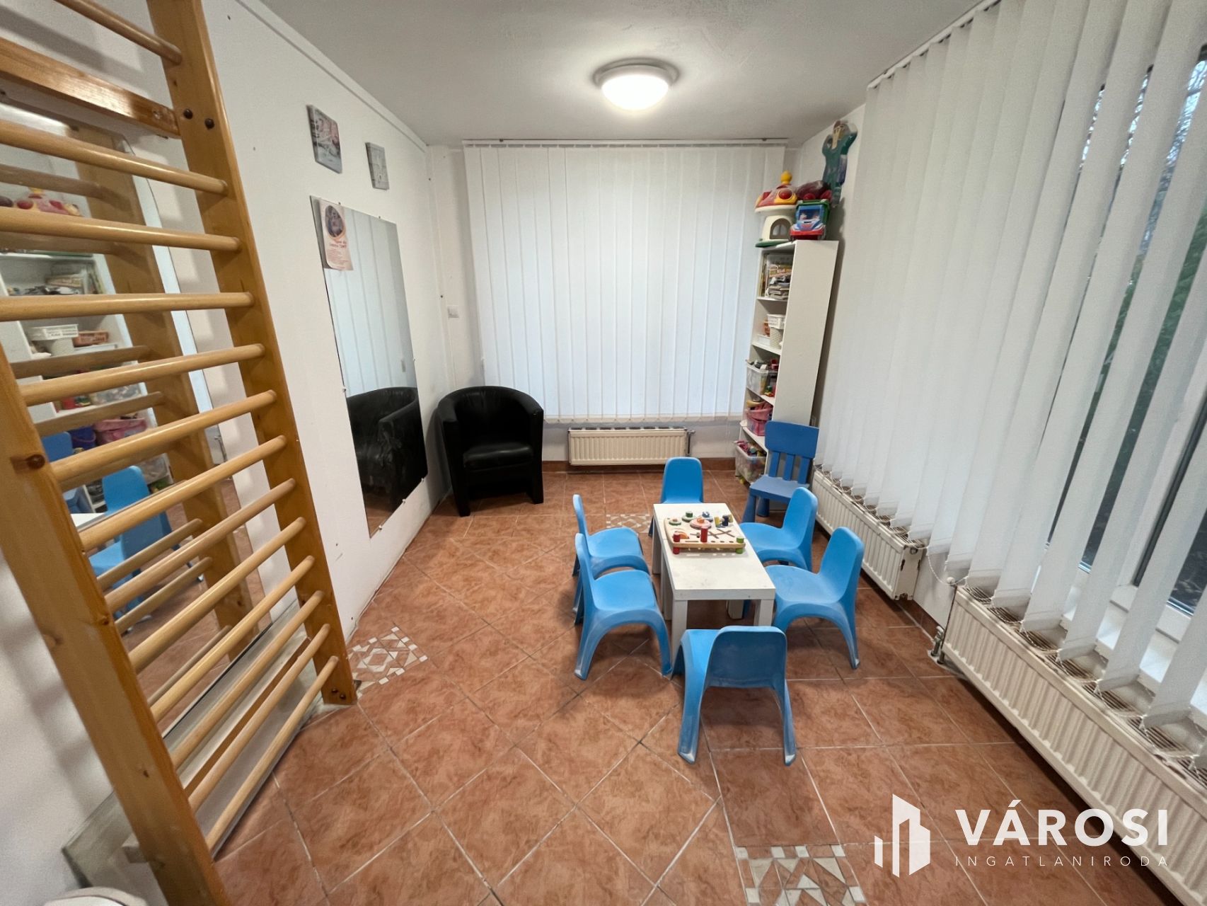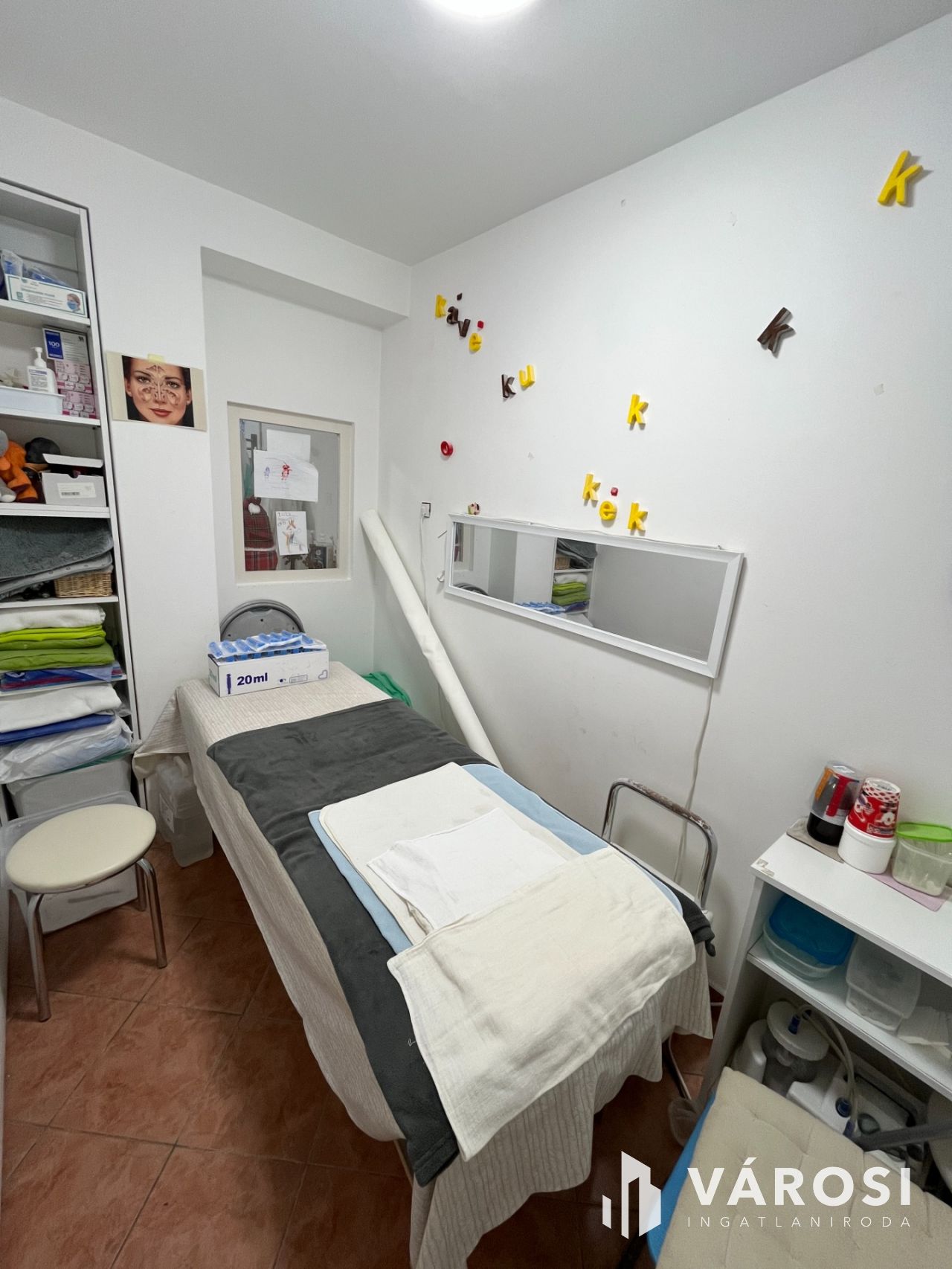 A helyiség praktikus elrendezéssel rendelkezik, három kezelőhelyiséggel, váróval, három mosdóval, teakonyhával minden igényt kielégít.