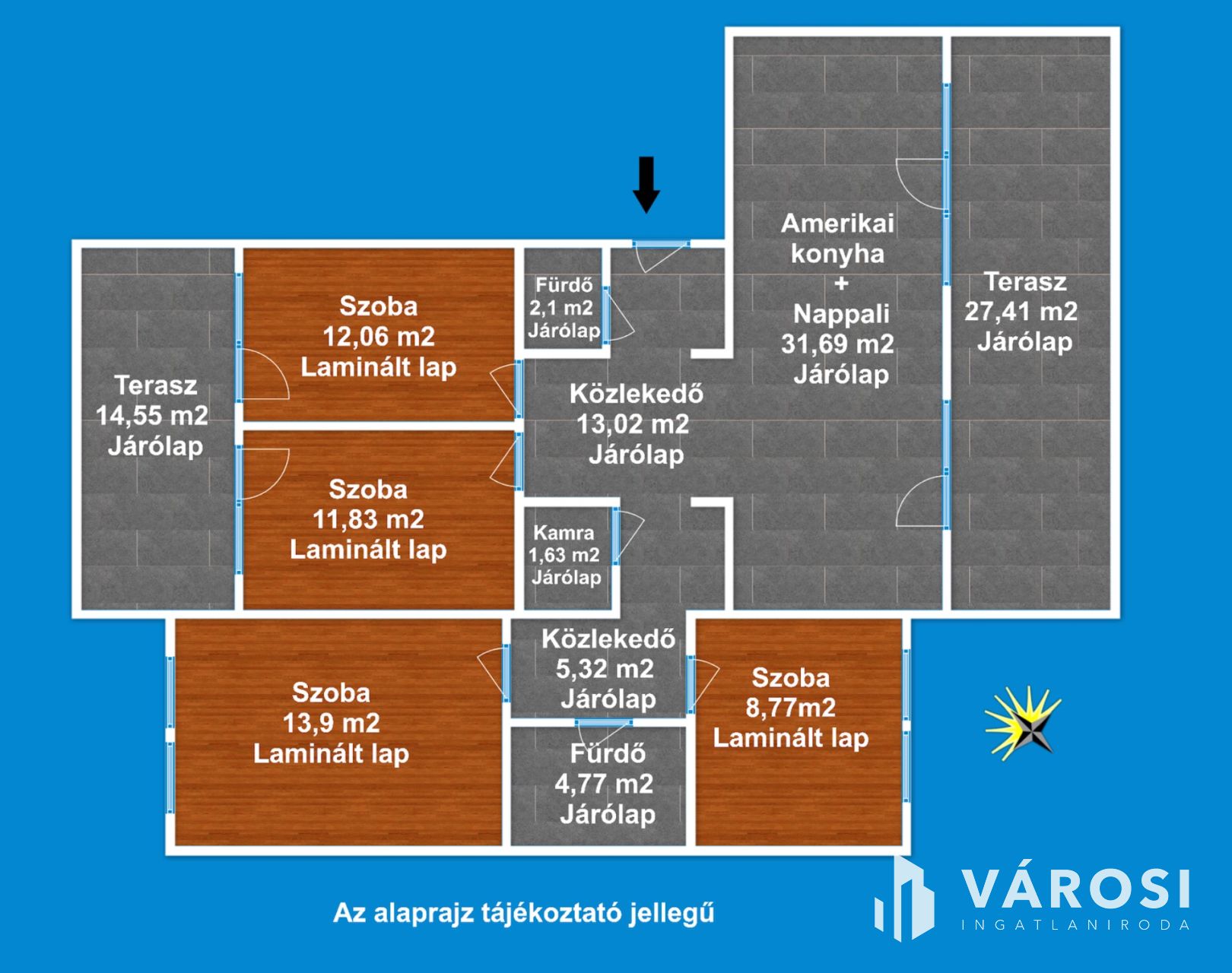 A lakás 1 db amerikai konyhás nappalival, 4 db hálószobával, 2 db fürdőszobával Wc-vel, közlekedővel, előtéttel, dupla terasszal rendelkezik.