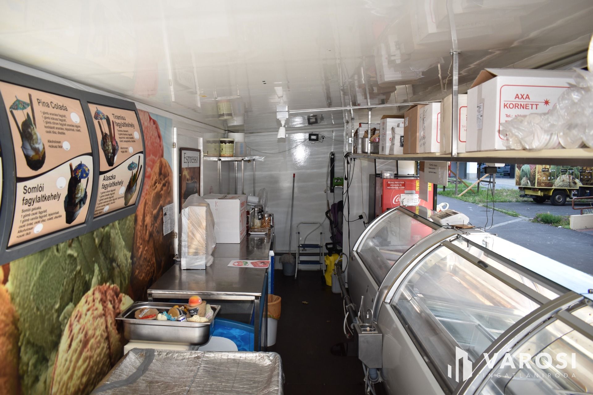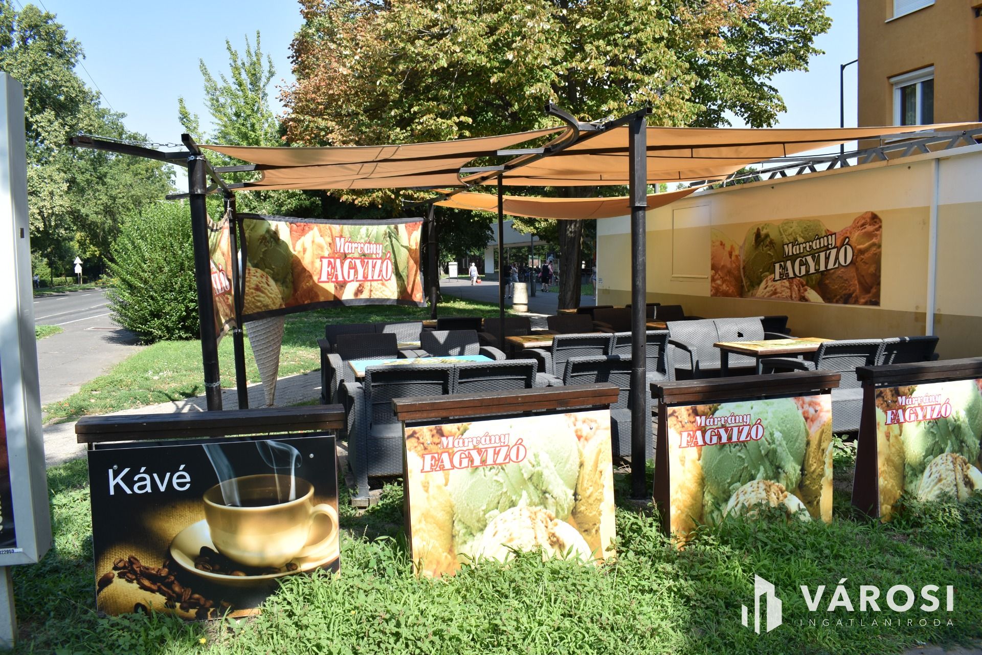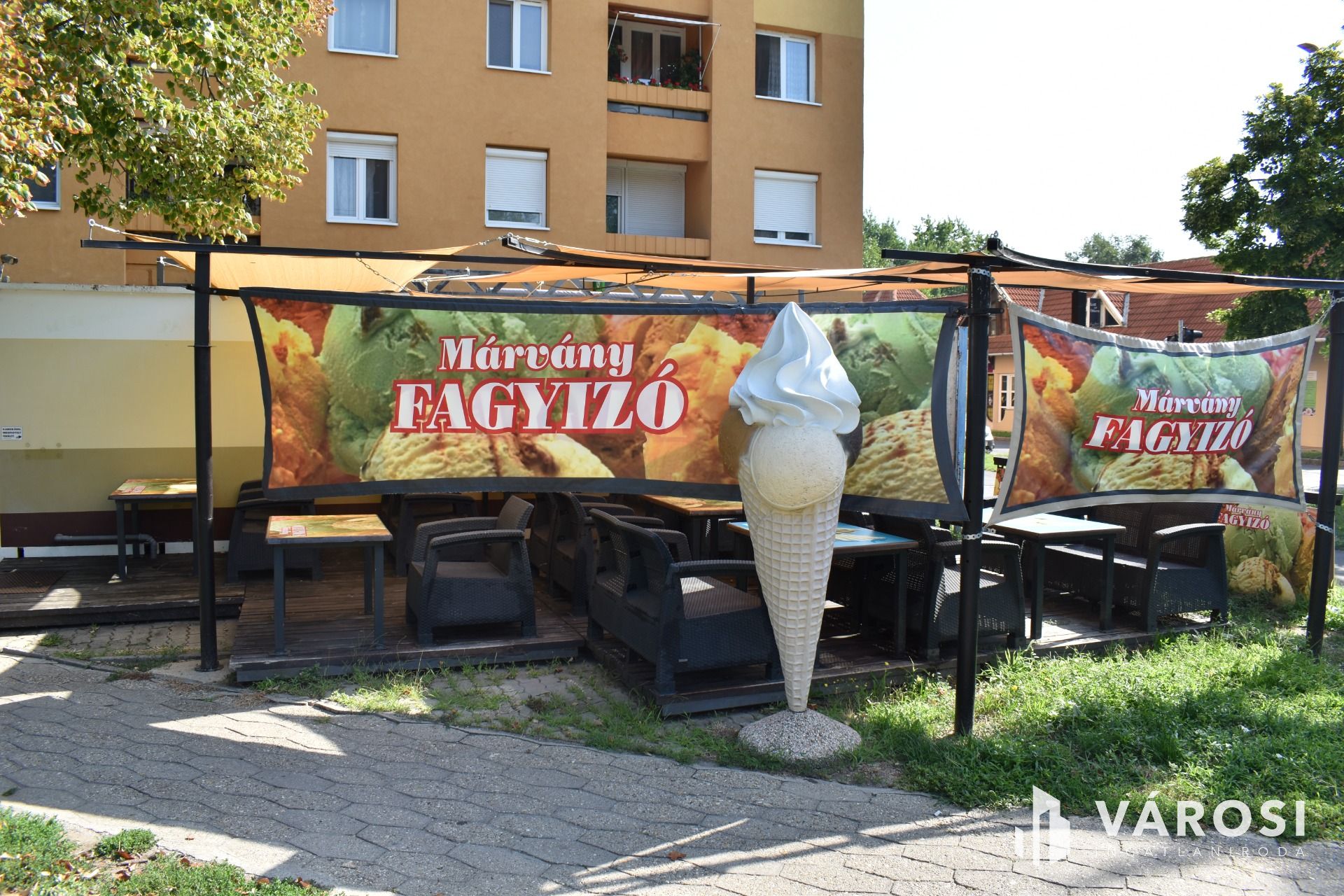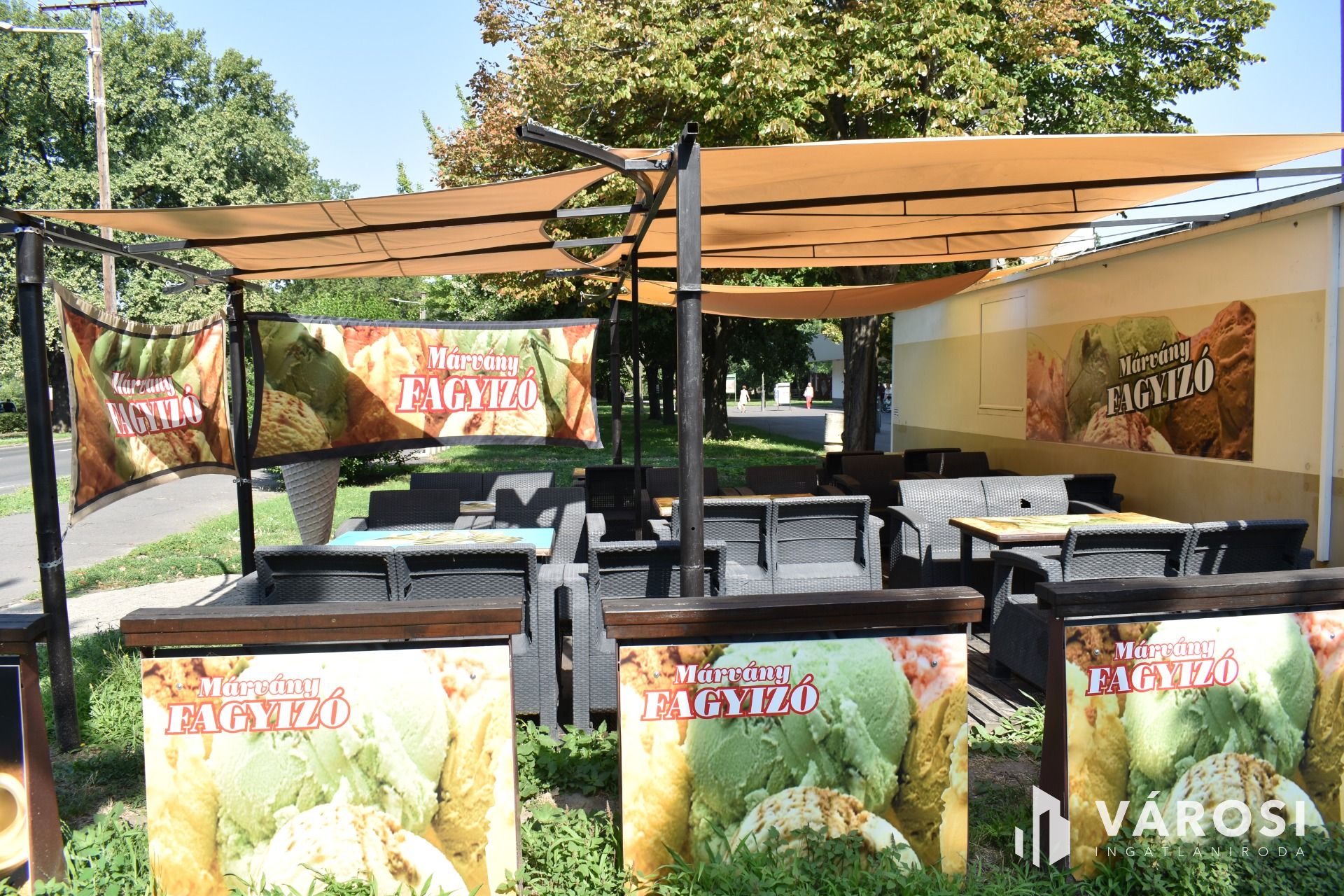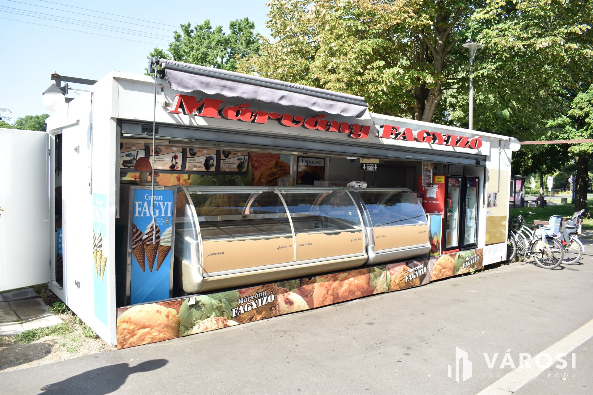 A vételár tartalmazza a fagylaltozóban lévő összes gépet, hűtőt, kerti garnitúrát és felszerelést.