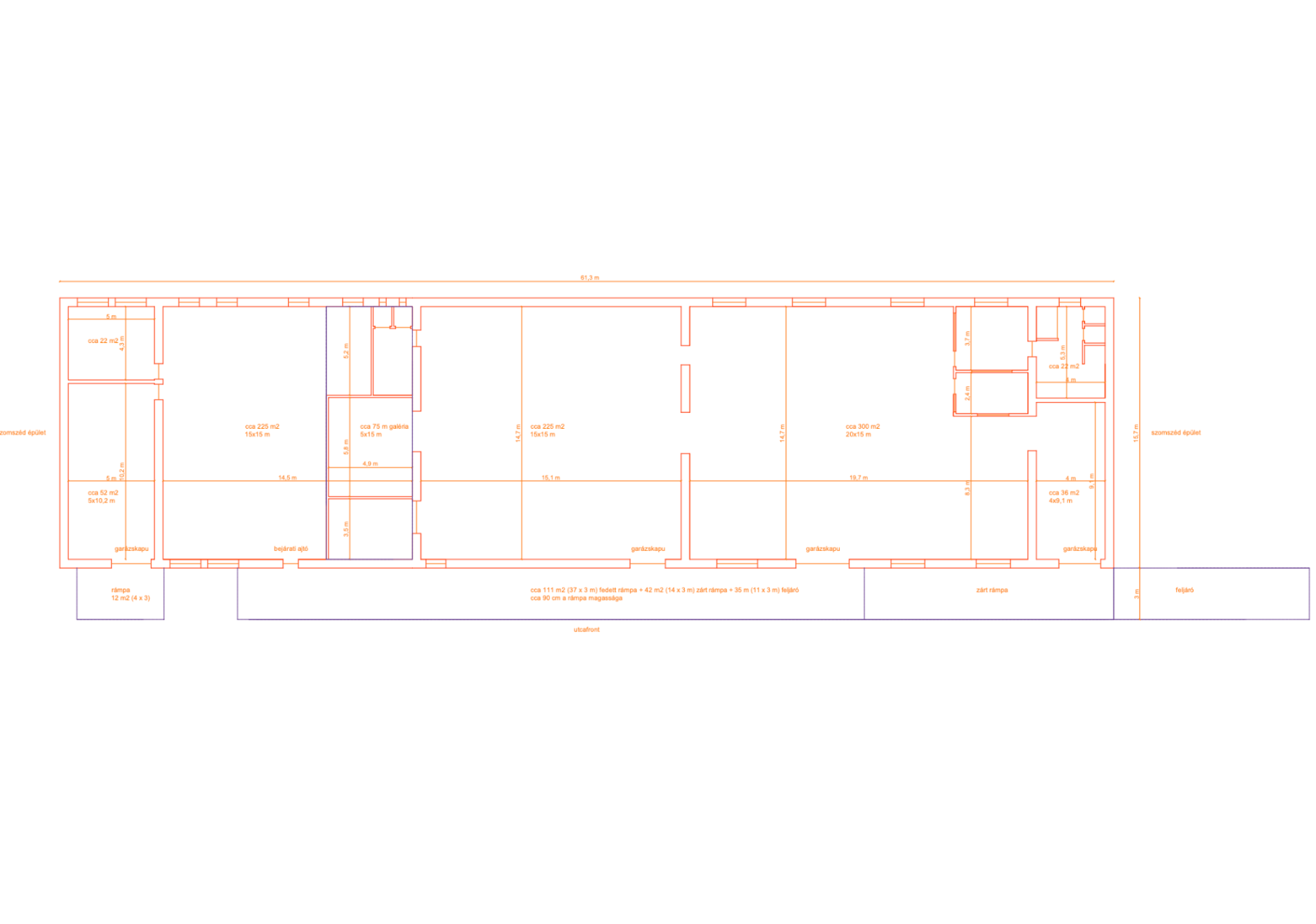 Teljes hosszban fedett, részben zárt 3 m mély rámpa (150 m²), ebből kb. 42 m² oldalról is zárt