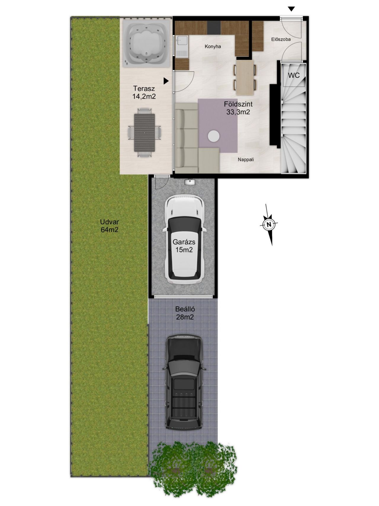 - Kertkapcsolat és kikapcsolódás: saját terasz és erkély, parkosított udvar automata öntözőrendszerrel, kertkapcsolat, jakuzzi.