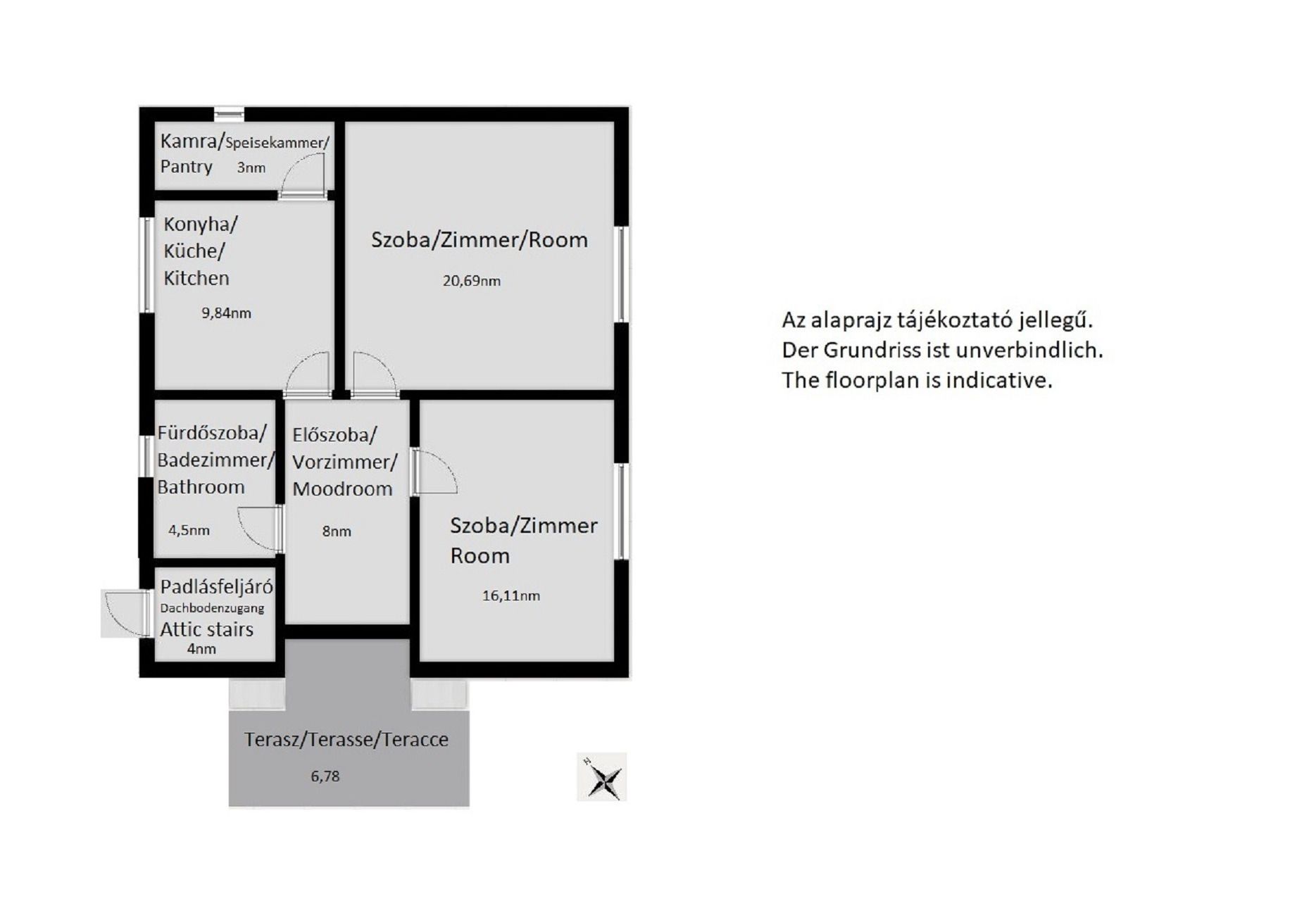 A ház nettó alapterülete 66 nm, melyhez egy 6 nm-es, fedett, nyugati tájolású terasz kapcsolódik.