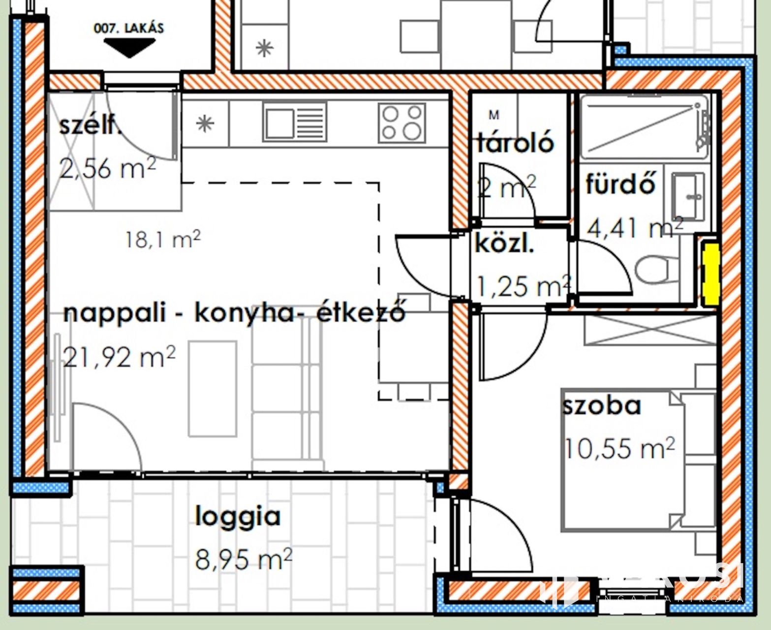 A 1 db amerikai konyhás nappalival, 1db hálószobával, 1 db fürdőszobával, közlekedővel, loggiával rendelkezik.