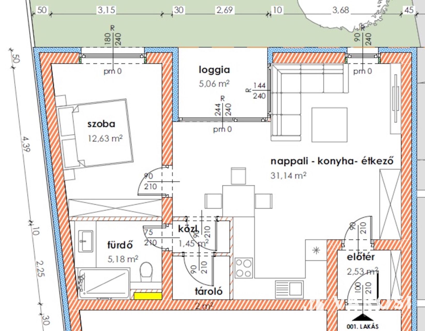A 1 db amerikai konyhás nappalival, 1db hálószobával, 1 db fürdőszobával, közlekedővel, loggiával rendelkezik.