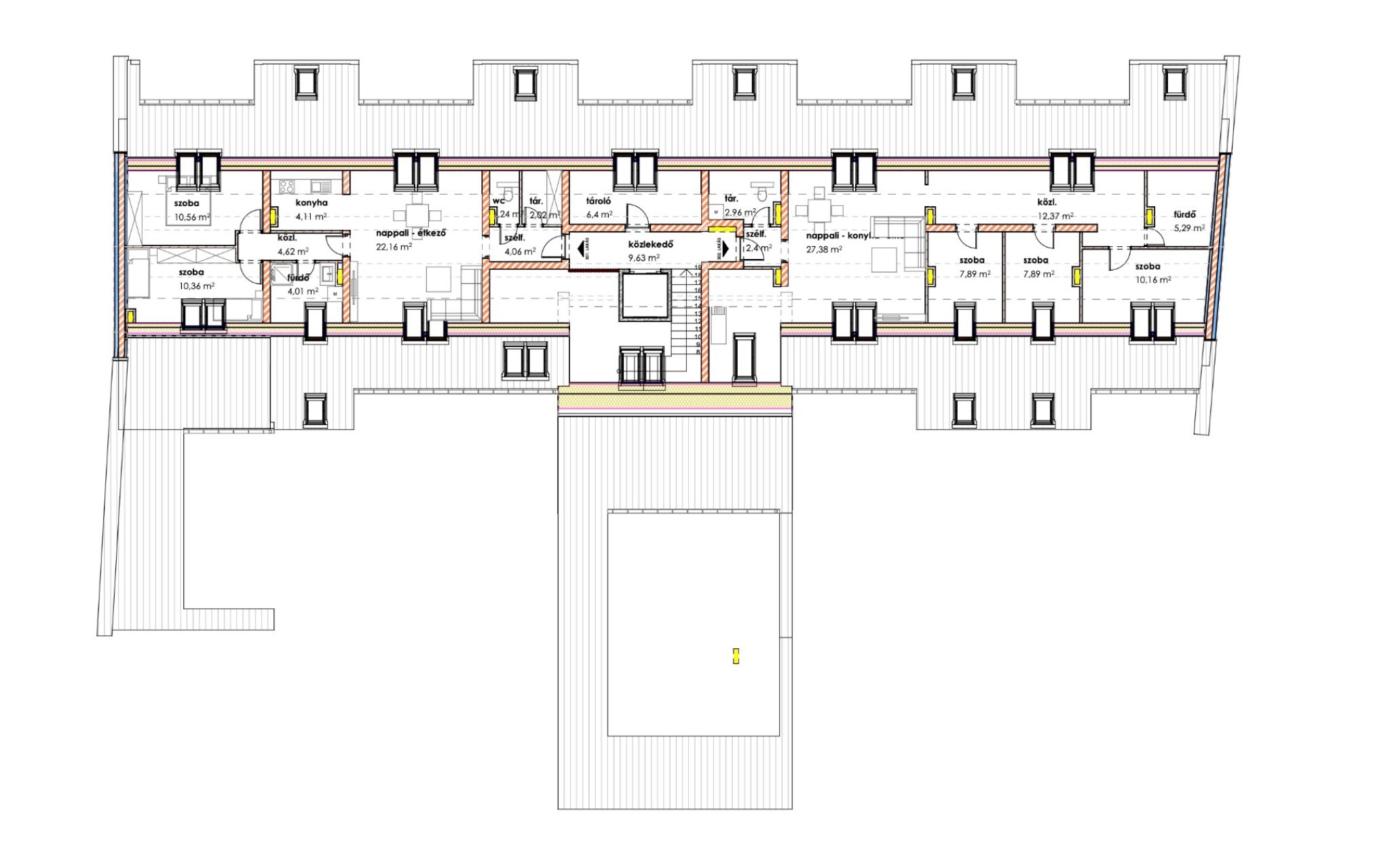A társasház összes 46 lakásból - 2 épületben, 28 Szent János tér, 16 Páva utca - áll, valamint tégla falazattal, monolit födémmel, készül el.
