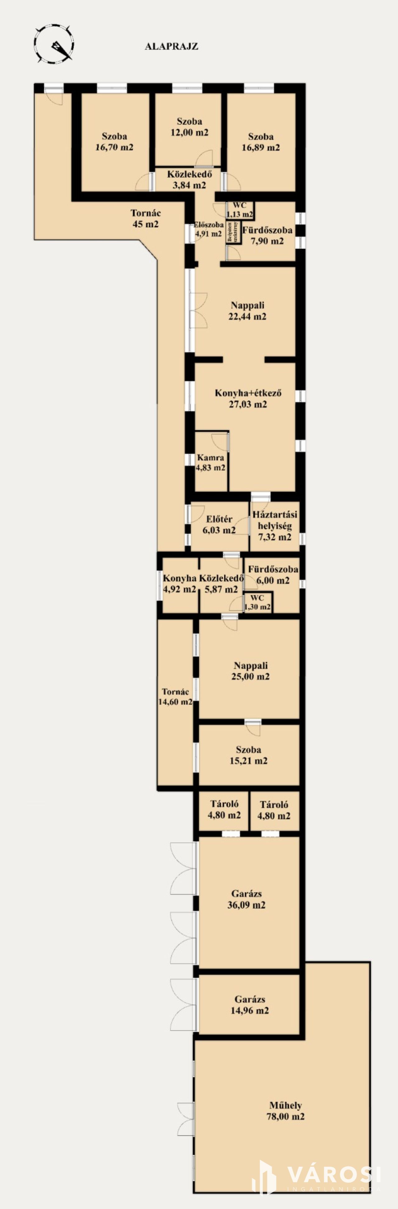 A telek, hátsó része külön kerített, ezen a részen három garázs, illetve egy vizesblokkal is rendelkező, 78 m2-es műhely került kialakításra.