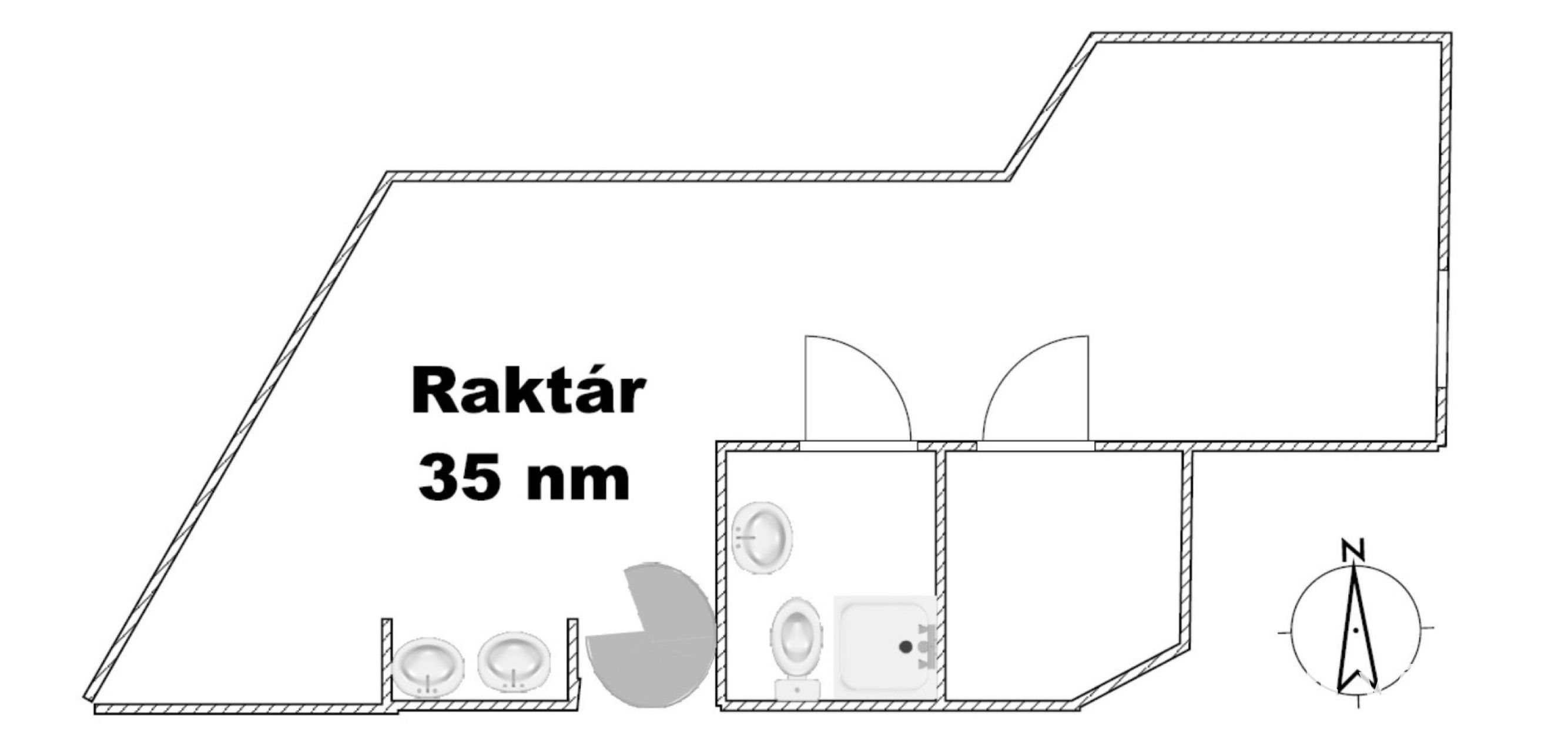 A téglafalazatú nem dohos, nem nedves pinceszinten iroda, vizesblokk (tusoló, mosdó WC) , raktárpolcok találhatók.