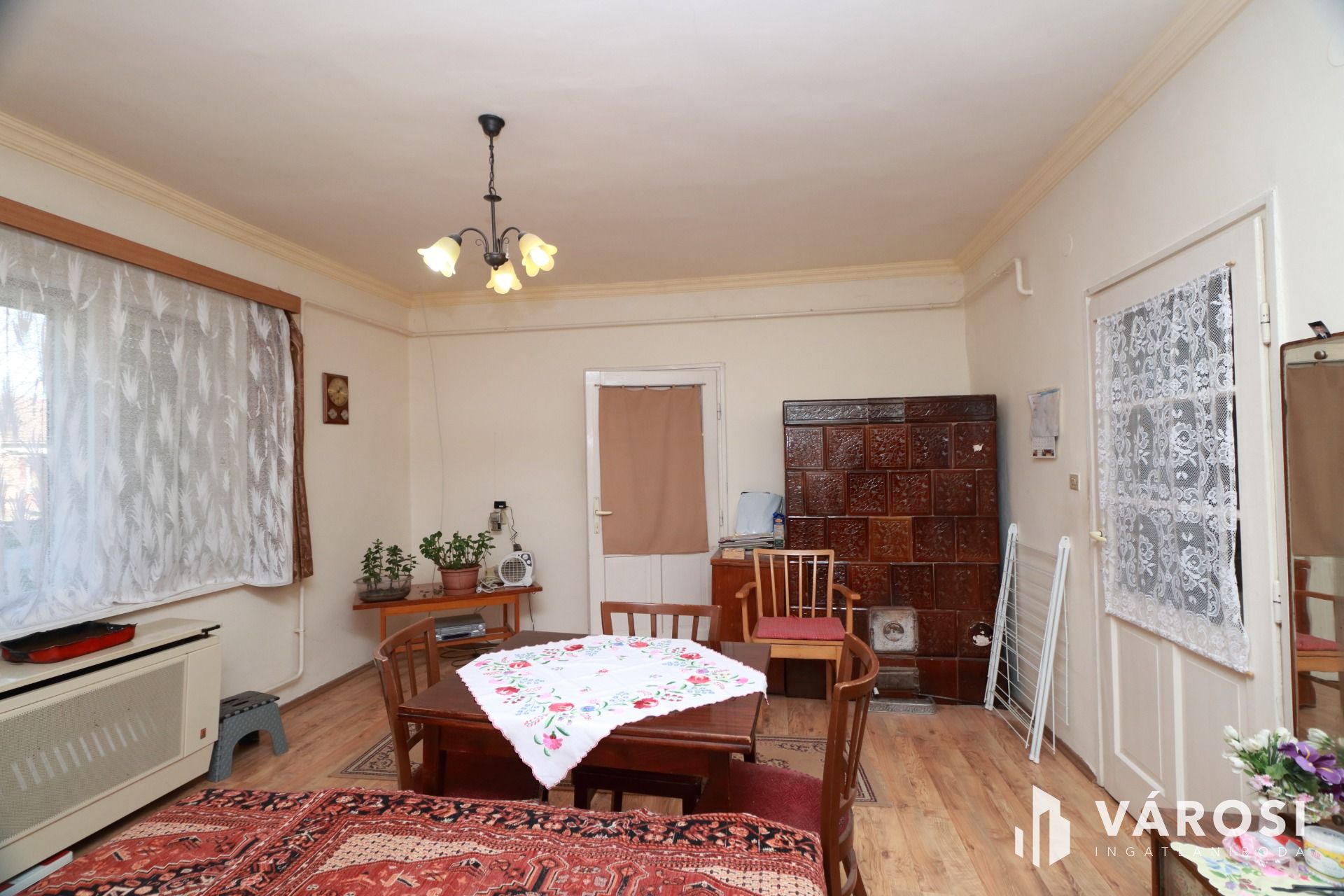 Az ingatlan fűtése konvektorokkal és egy működő cserépkályhával történik.