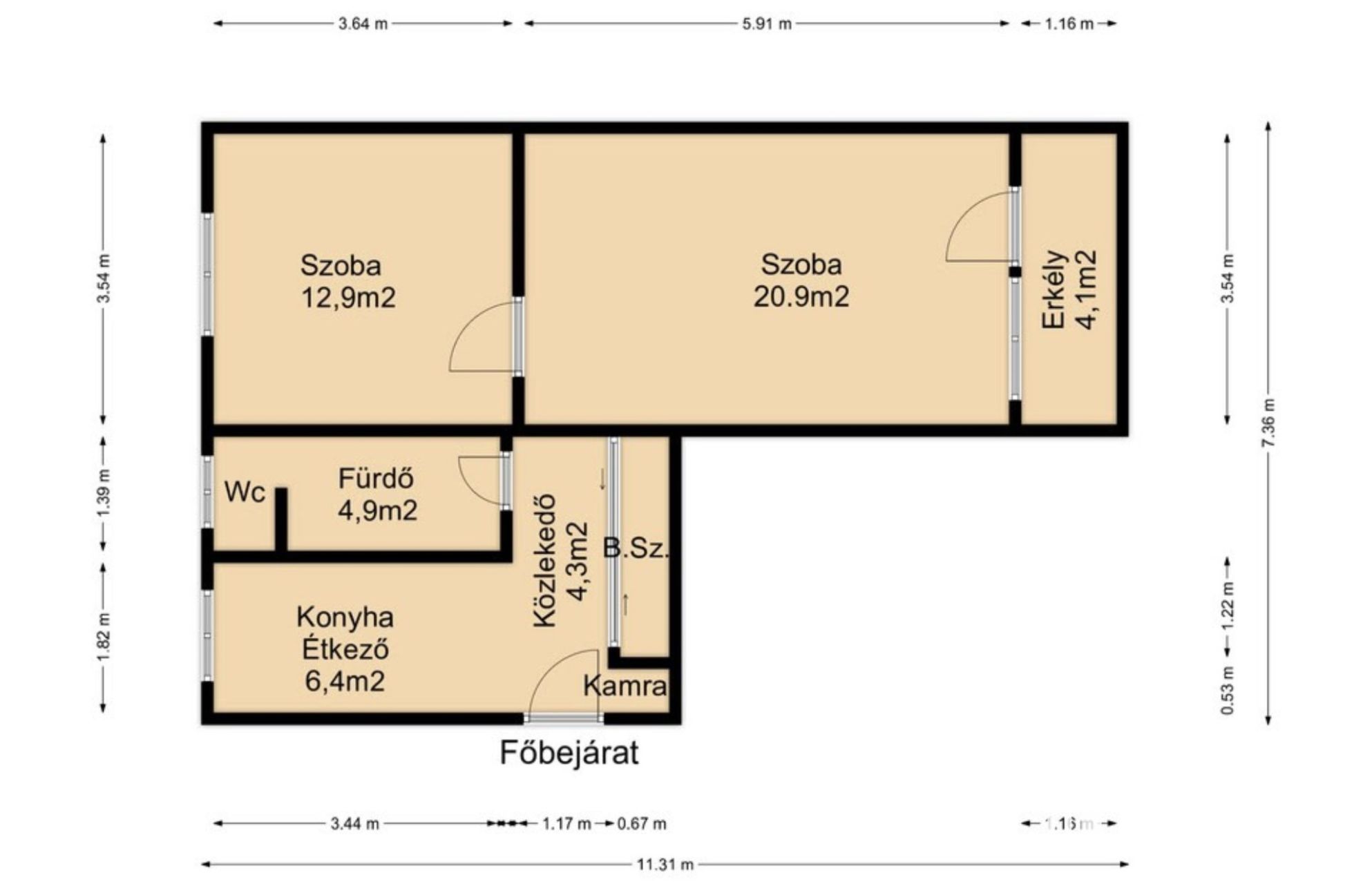 Belső lakrész helységei: konyha étkező, közlekedő, fürdő mellékhelységgel együtt, 1 szoba, 1 nappali melyhez erkélykapcsolat is tartozik.