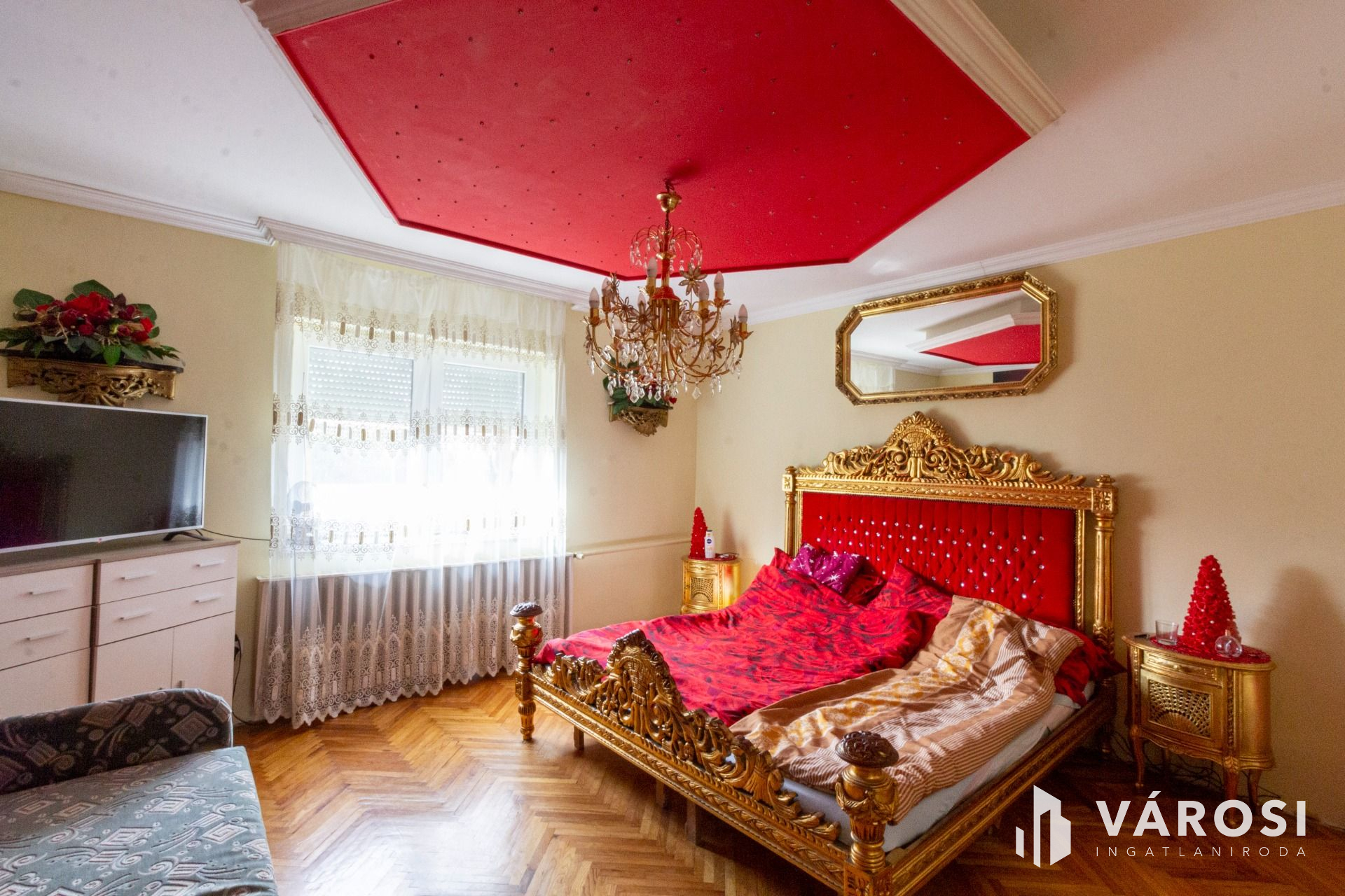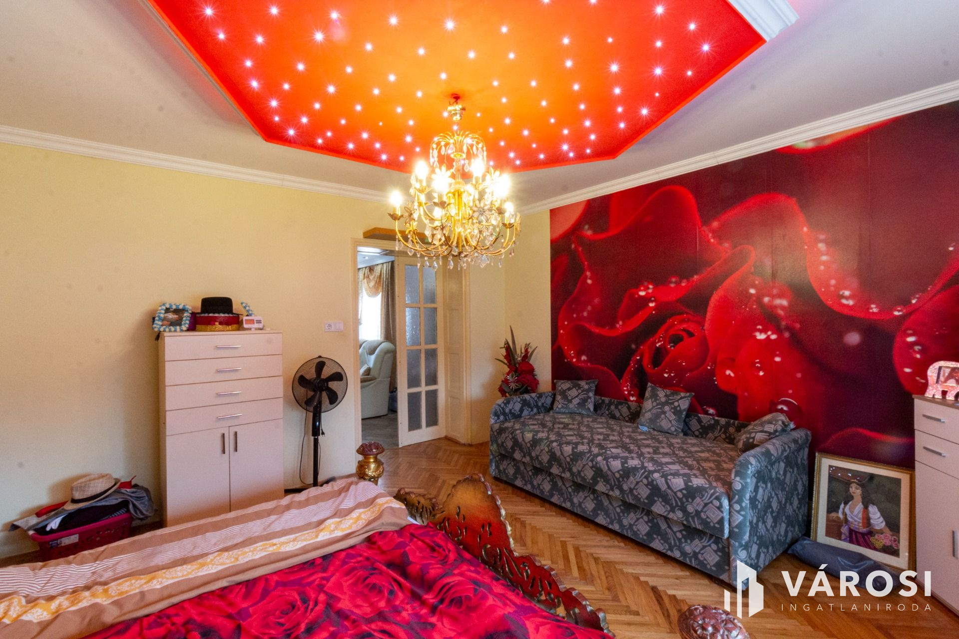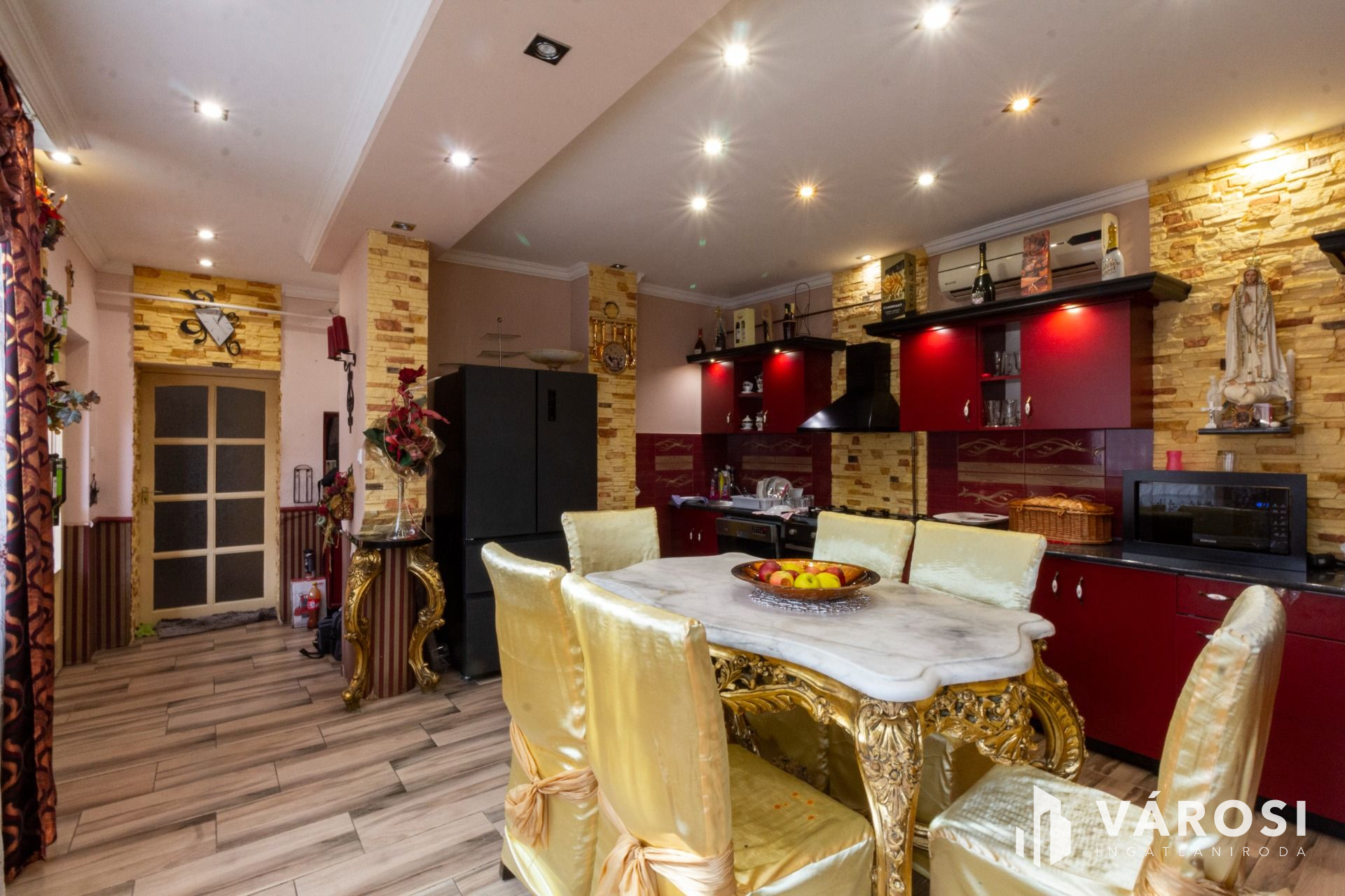 A lakásba belépve jobbra az amerikai konyhás étkező, balra pedig a nappali található, amelyből további két szoba nyílik. A szobák parkettások, a többi helyiség hidegburkolatú. Az L alakú ingatlan hátsó részében, külön bejáratú apartman lett kialakítva. Albérletnek kiadható lakrész.