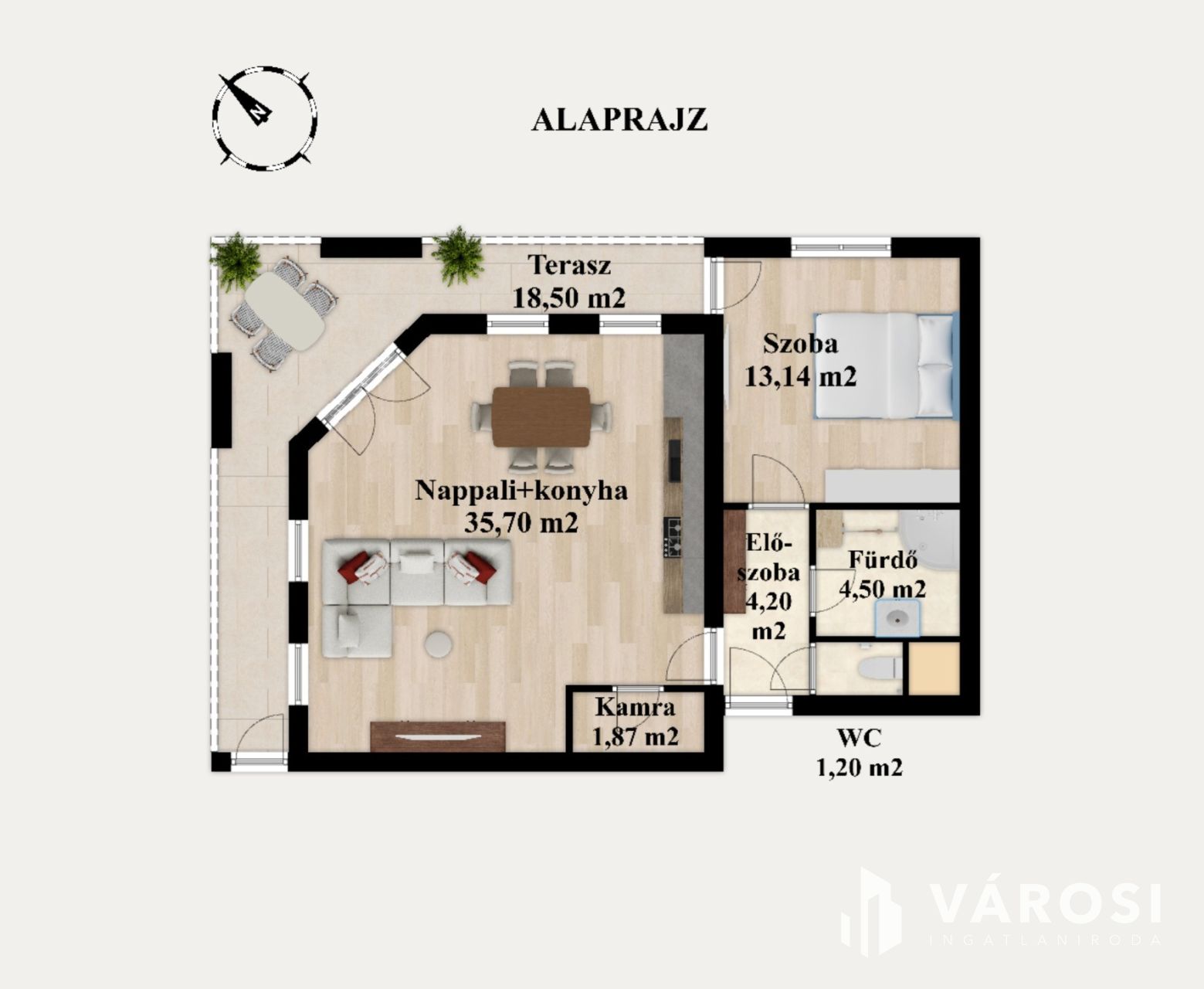 - Nappali + 1 hálószoba, amerikai konyhás kialakítással – tágas, világos tér a kényelmes mindennapokhoz