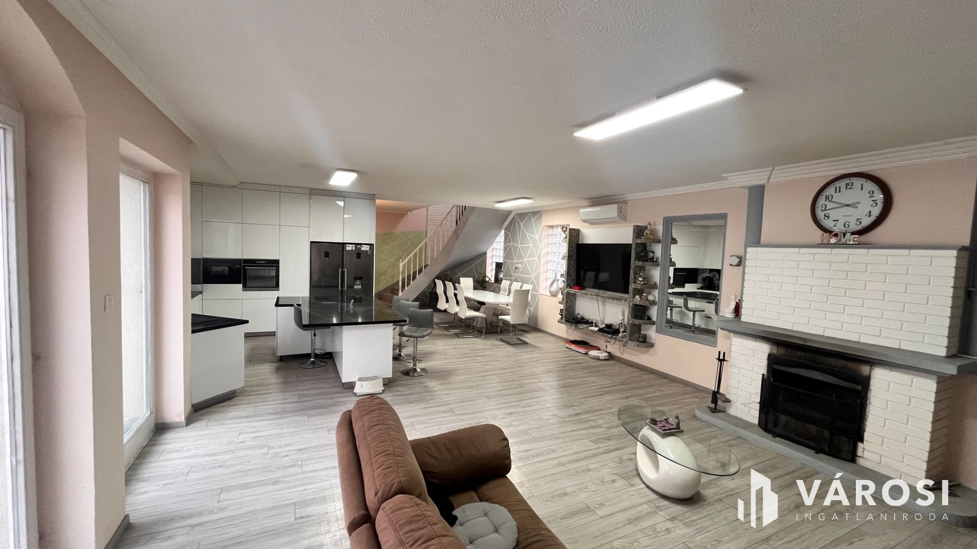 A ház 5 szobából és 1 nappaliból áll, így mindenki megtalálhatja a maga privát terét. A konyha modern és jól felszerelt, az amerikai konyhaszigetnek köszönhetően pedig könnyedén össze lehet kapcsolni az étkezővel. A nappaliban kényelmes kandalló gondoskodik a kellemes hangulatról.