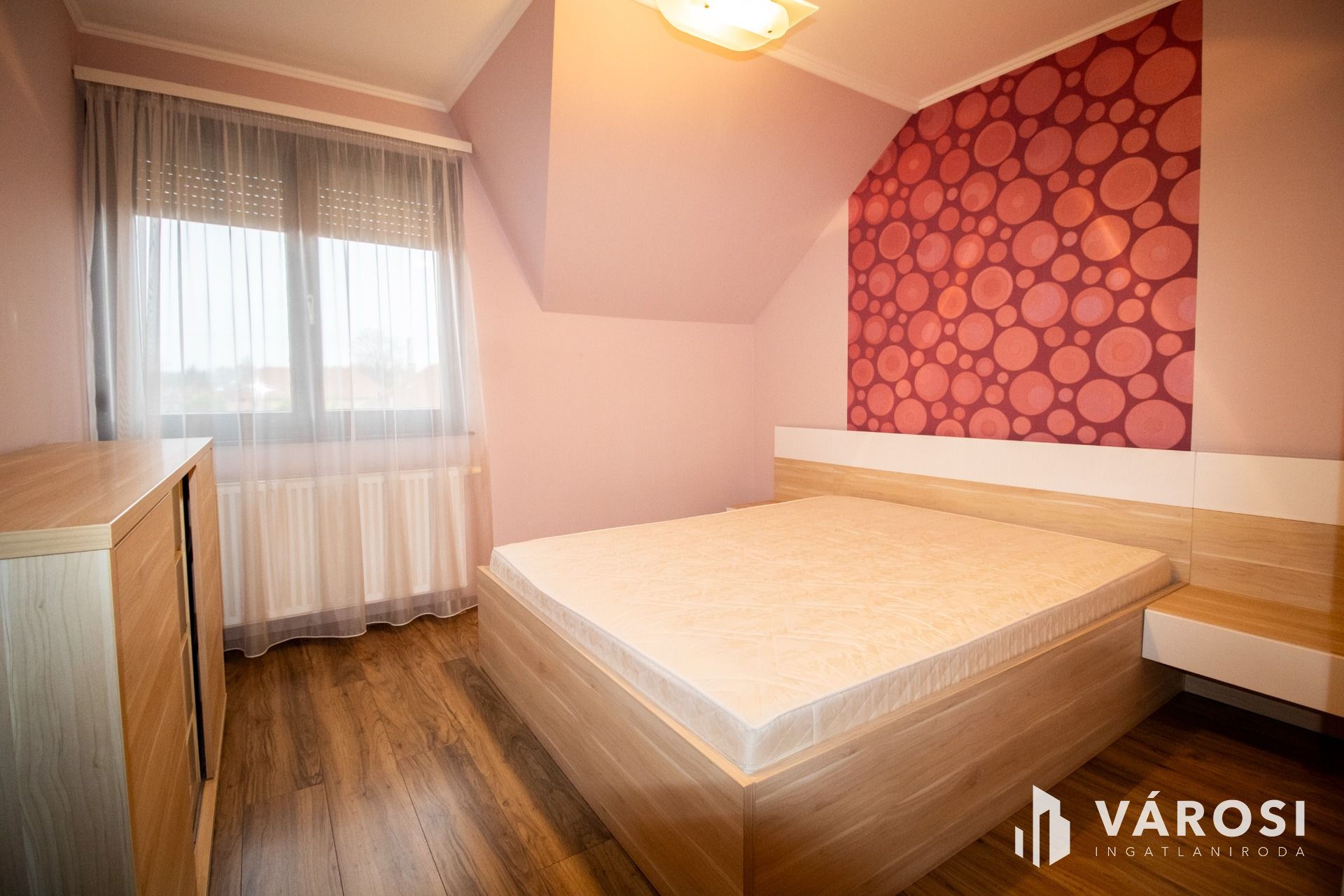 A lakás az első emeleten, a tetőtérben helyezkedik el, ahová kizárólag ehhez az ingatlanhoz tartozó, saját lépcsőházon keresztül juthatunk fel. A belső terek fiatalosak és rendkívül praktikus elrendezésűek: a közlekedőből nyílik a világos nappali és a modern konyha–étkező, amelyhez egy elegáns, kovácsoltvas korlátos erkély kapcsolódik. A két hálószoba jól szeparált, a külön WC és a mindkét irányból megközelíthető fürdőszoba pedig gondosan átgondolt, kényelmes megoldást nyújt a mindennapokban.