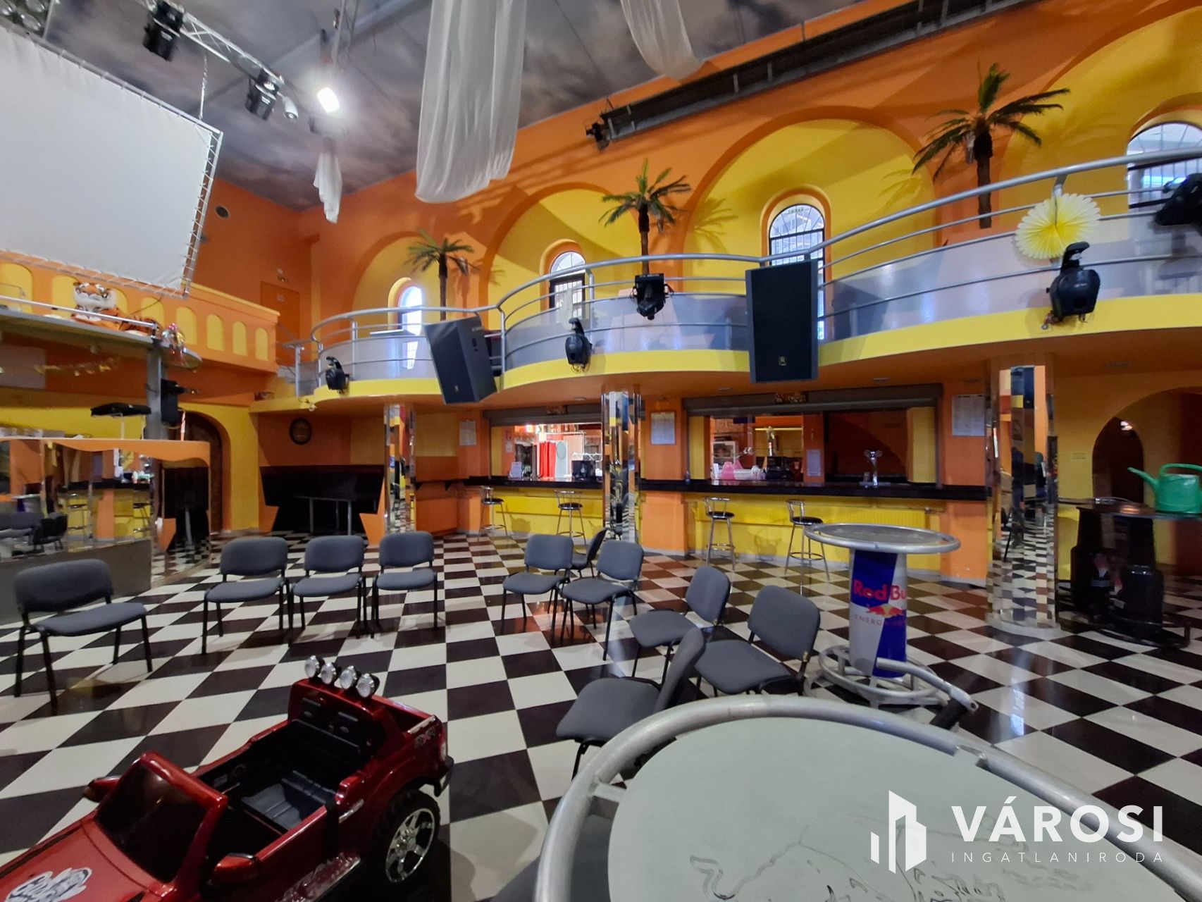 A területen található két szintes épületet szilárd burkolatú parkoló veszi körül. Az épület teljesen működőképes belső térrel rendelkezik, zenés-táncos vendéglátó hely. A helyszín magában foglal egy 400 négyzetméteres nagytermet, egy 100 négyzetméteres kistermet, színpadot és kapcsolódó helyiségeket, öltözőket, valamint egy 200 négyzetméteres fedett teraszt, melynek fagerendás tetőszerkezete 3 éve készült.