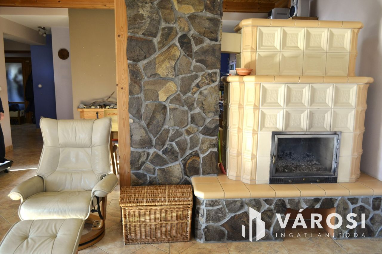 In addition, thanks to the solar panels, the home can also be heated with electricity, and there are also two beautiful tile stoves.