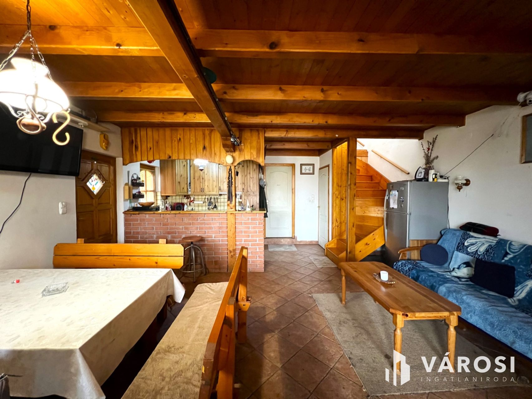 A természet közeliség megjelenik a házon belül is, sok faanyag került beépítésre, gerendázott mennyezete is az otthonosság érzetét növeli.