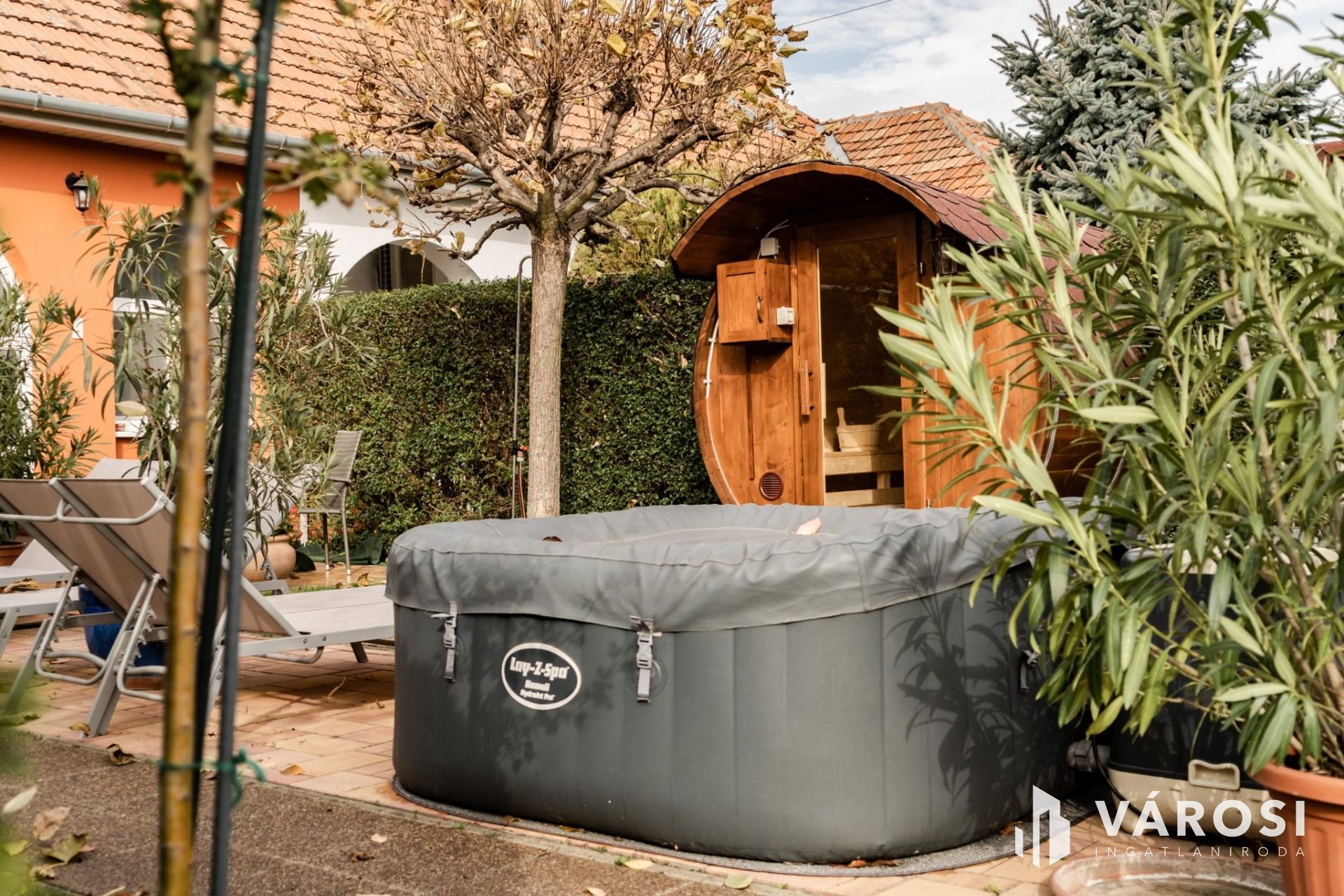 Az udvaron található egy különálló, 10 m²-es faház, amely kifejezetten az üzemeltetéshez vagy háztartási funkciókhoz szolgál tárolóként: itt kényelmesen elférnek textíliák, ágyneműk, takarítóeszközök, kerékpárok, babafelszerelések vagy szezonális bútorok. Ugyancsak az udvar része a hangulatos, 6 személyes szauna, valamint a 4 személyes jakuzzi, amely téliesítve van, így a használat időszakosan szabályozható.