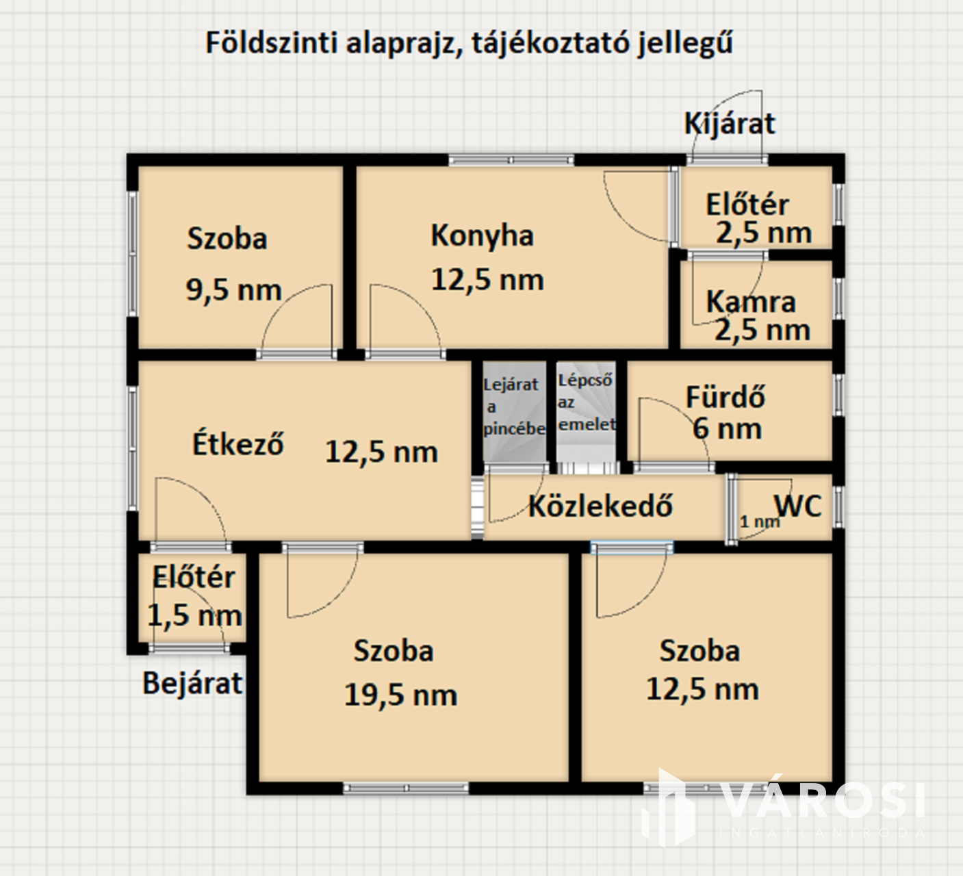 A ház földszinti részén található egy nappali/étkező rész és akár 3 szobának alkalmas helyiség, egy konyha + spájz és egy fürdőszoba + külön WC.