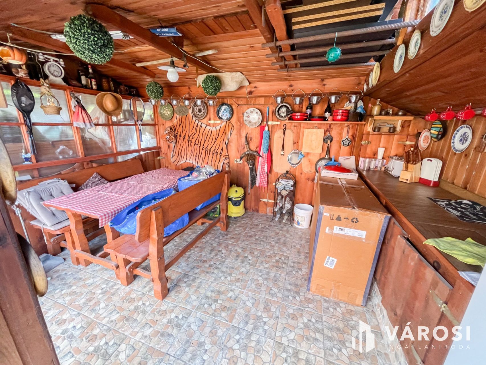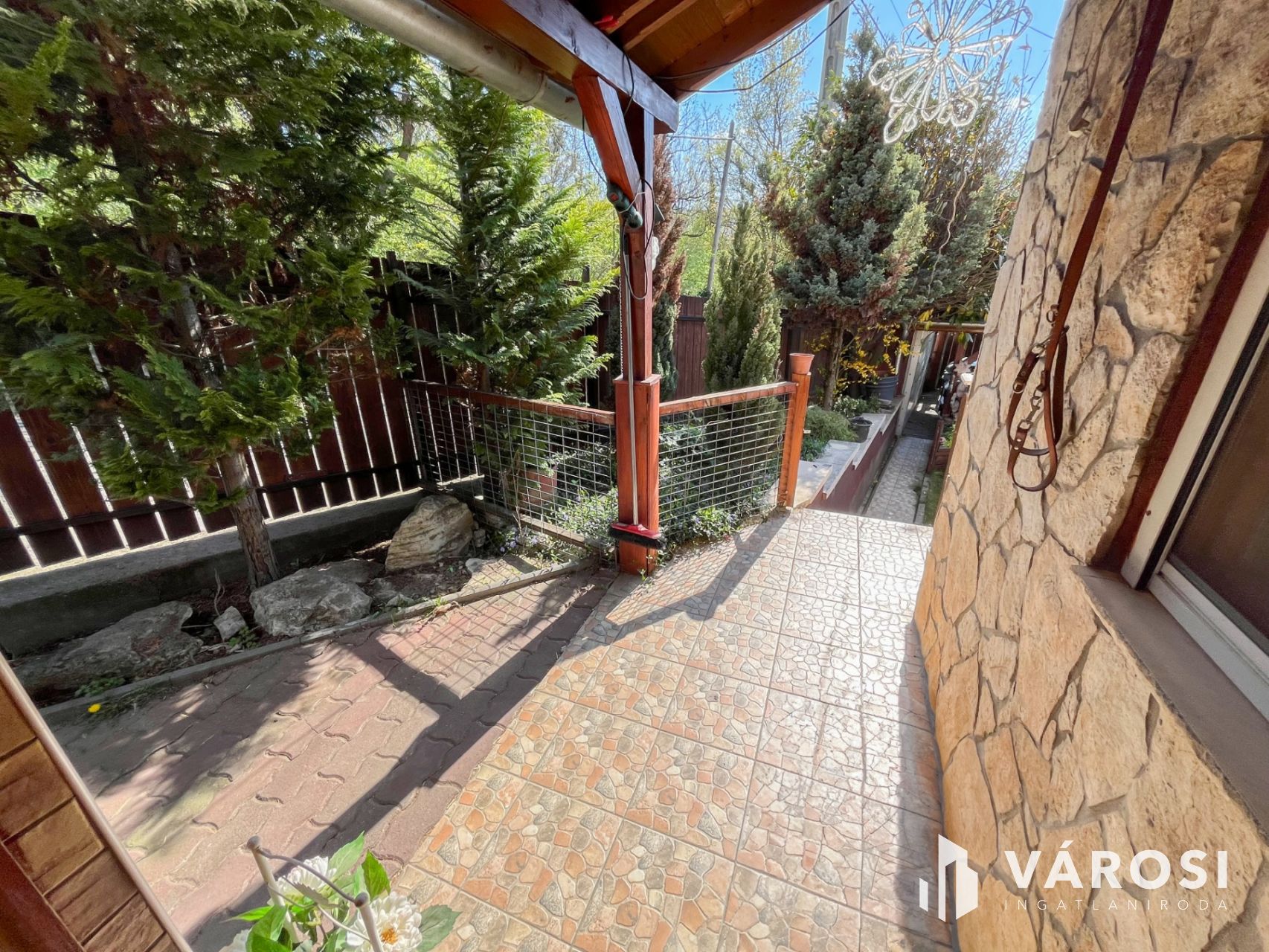 Két autó parkolására is alkalmas, fedett garázs, előkert, családi vagy társasági életre alkalmas oldalkert kerti konyhával, sütőgetővel.