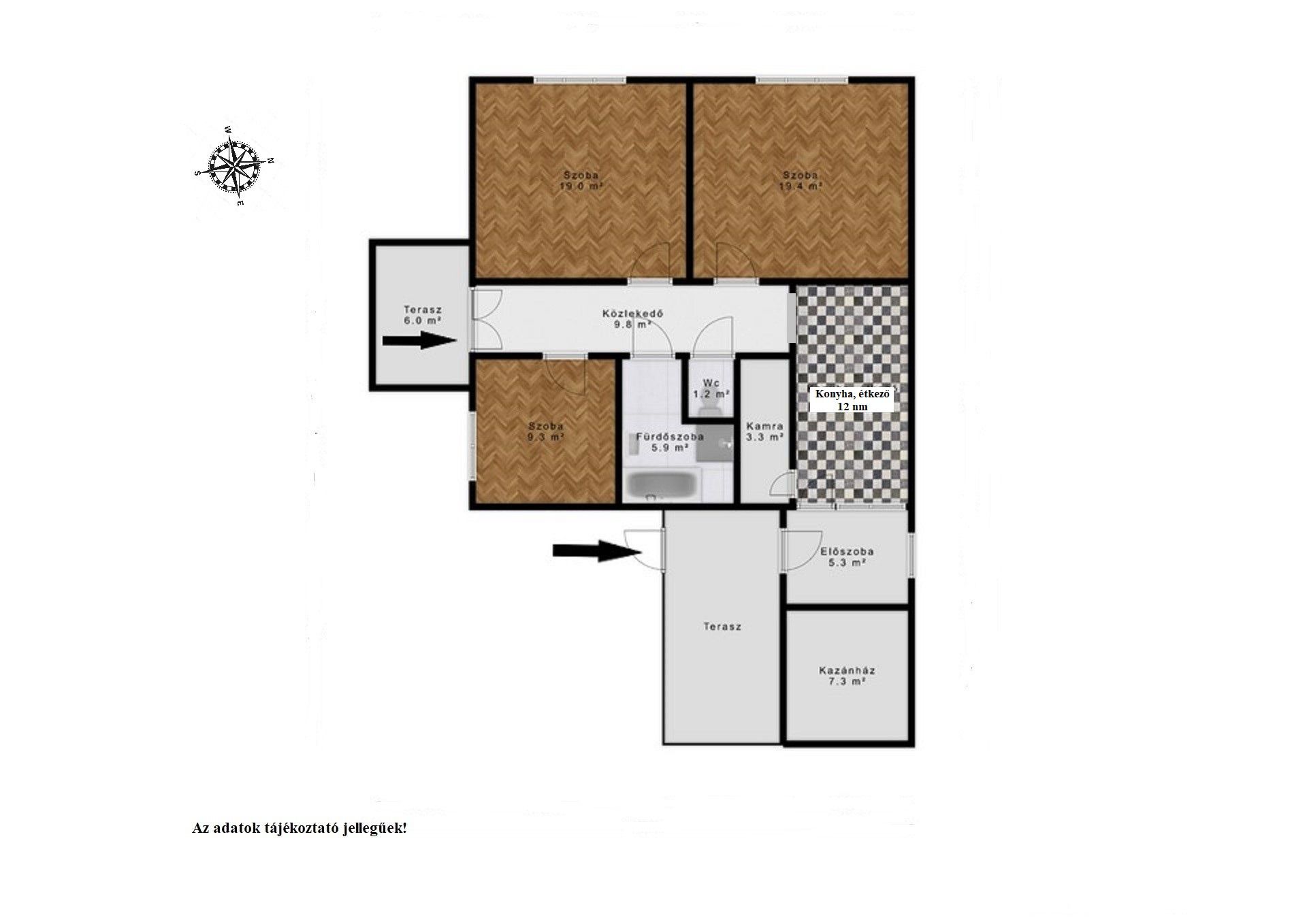 Helyiségei: 2 + félszoba, előszoba, fürdőszoba tusolóval, külön Wc, konyhahelyiség, kamra, kazánház.