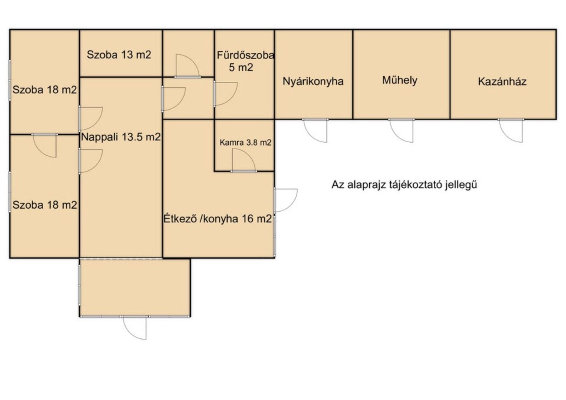 A lakóházban 2 nagyszoba, 1 félszoba konyha+étkező, előtér, fürdőszoba külön WC-vel, nappali.