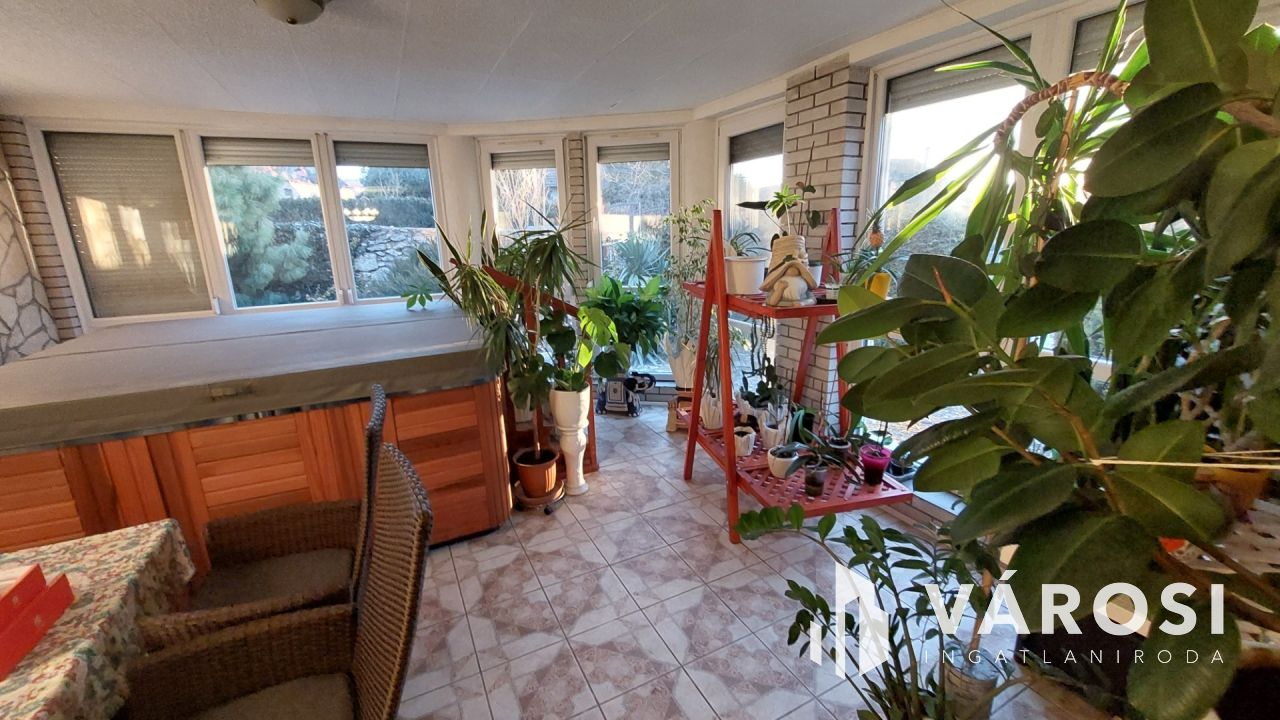 A két szintes, 200 m2-es családi házban földszinten és emeleten egy-egy nappali, fürdőszoba és hálószobák találhatók. A földszinti nappalihoz téli kert csatlakozik 8 személyes jakuzzival. Innen közvetlen kijárat nyílik a gondozott kertbe és az egyik teraszra. Az alsó lakótérhez kazánház és két garázs tartozik. Az emelet külön bejáraton keresztül is megközelíthető, így akár külön lakrész is lehet.