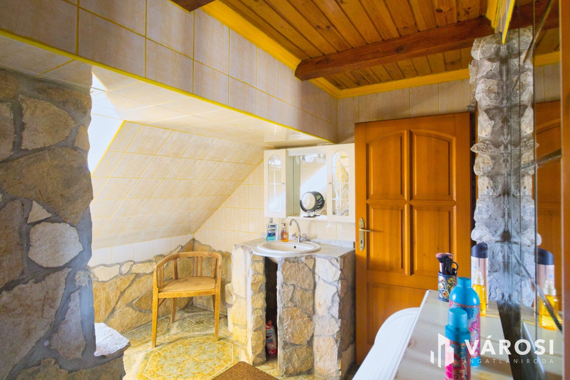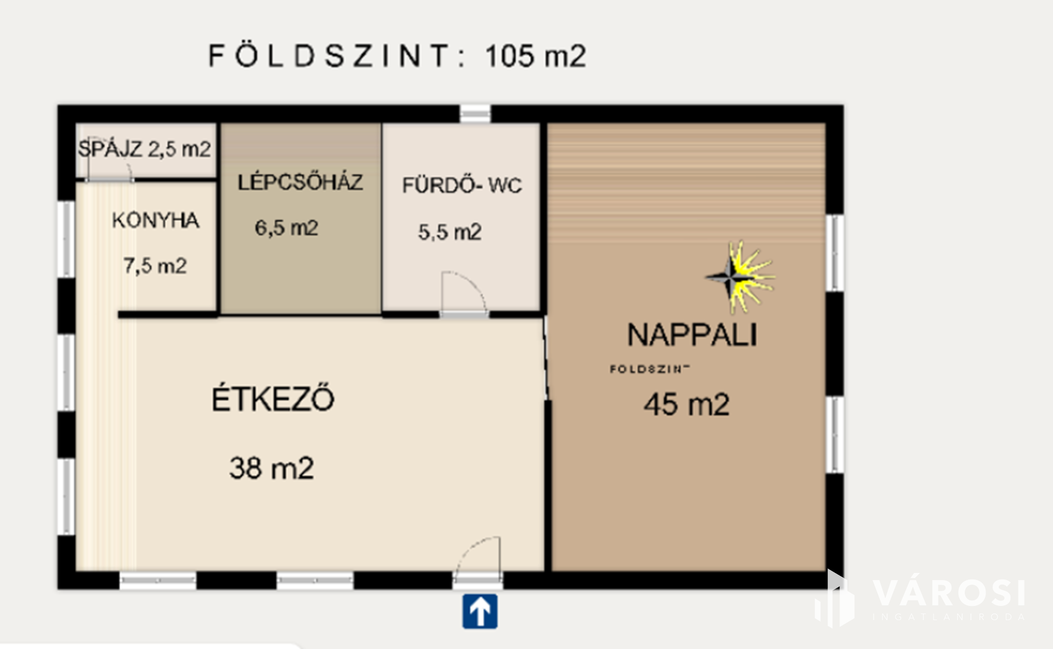 FÖLDSZINT: 1 nappali 45 m2, 1 étkező 38 m2, 1 konyha 8 m2, spájz, fürdő + WC.