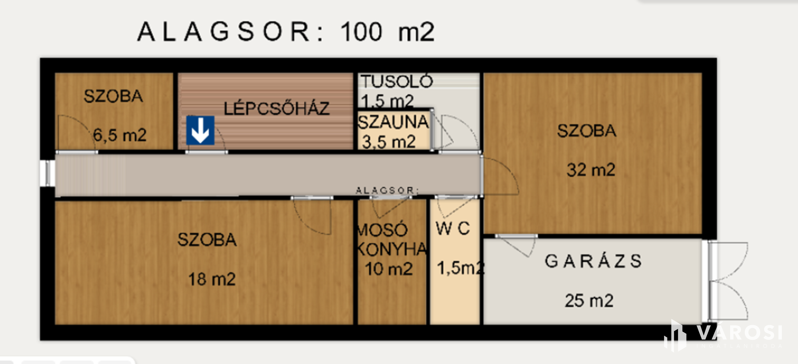 ALAGSOR: Folyosó, 3 szoba, 1 fürdő, 1 szauna, WC, mosókonyha, garázs.