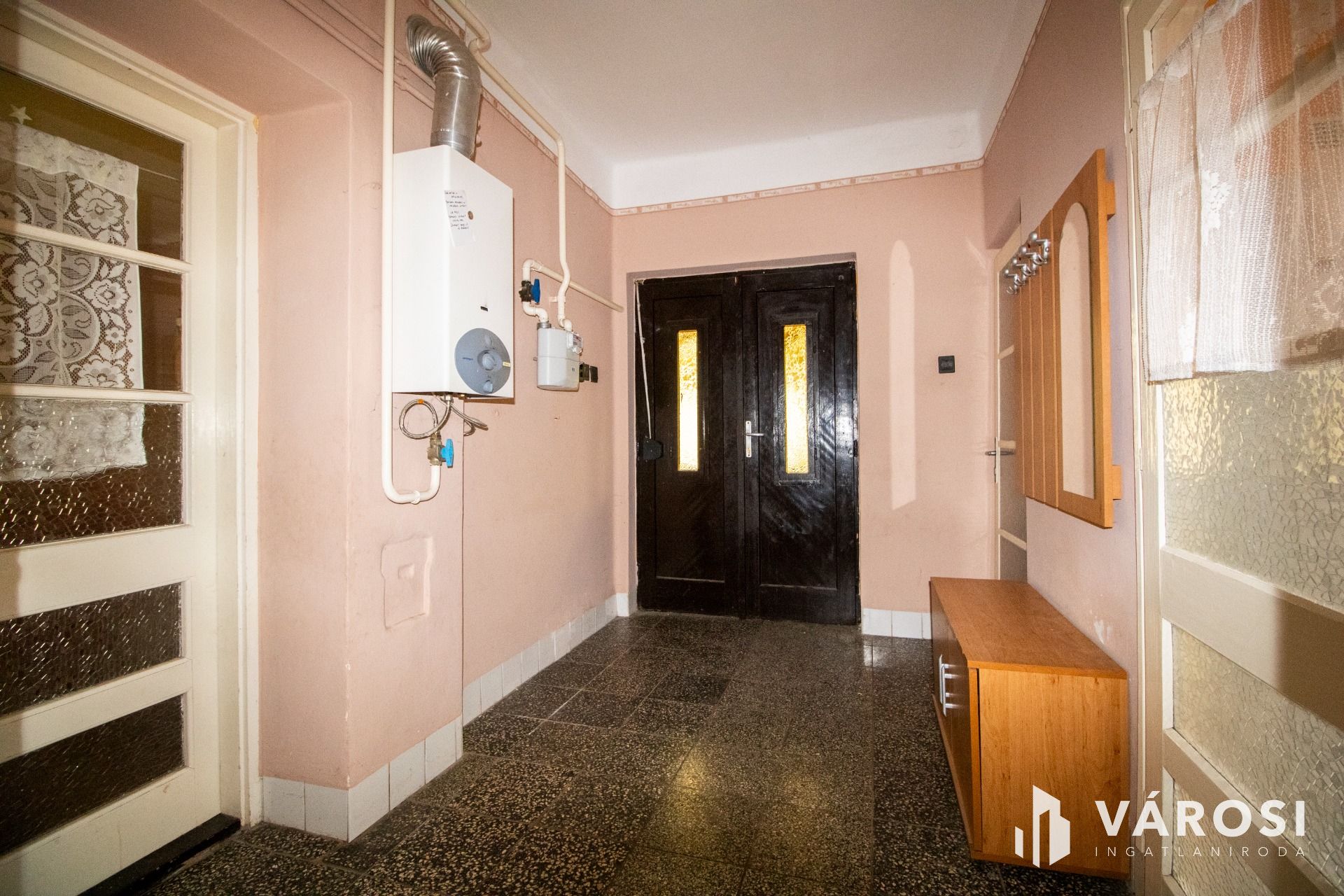 A ház oldalán egy fedett teraszról lépünk be, innen jutunk a folyosó/közlekedőbe. A közlekedőből balra nyílik a külön WC és a fürdőszoba, amelyben kád és zuhany is van, jobbra találjuk az egyik lakószobát, szemben pedig a tágas, világos konyha–étkezőt. A konyhából nyílik a másik lakószoba, valamint a spájz–kamra rész, ahonnan egy hátsó kijáraton át ki tudunk menni a hátsó udvar felé lévő kis teraszra. A kamra és spájz egybenyitásával, akár még egy plusz szoba is kialakítható, tehát az ingatlan bővíthető. A tetőtér beépíthető, így hosszabb távon is jó alap egy családi otthonhoz.
