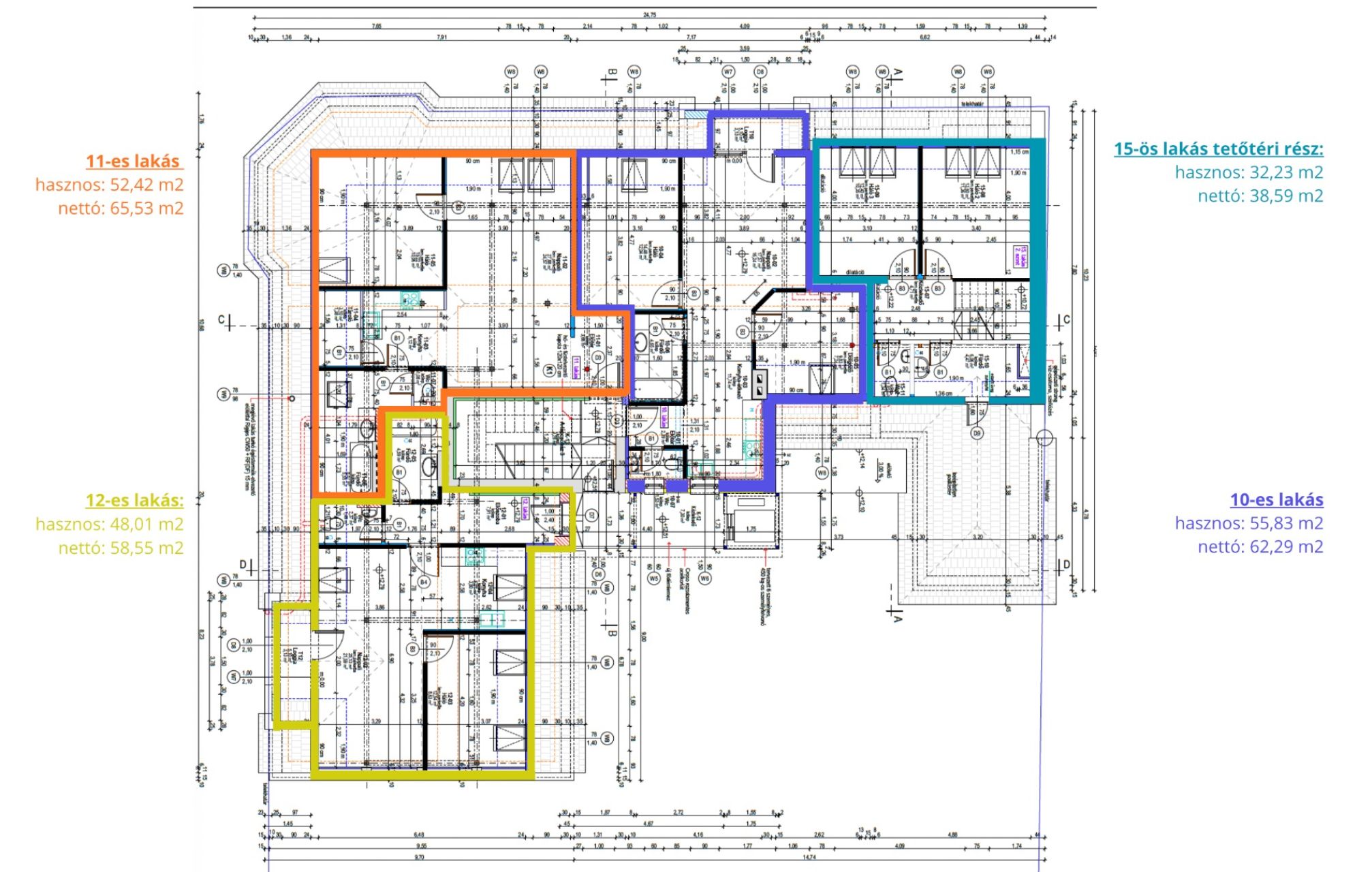 Az alaprajzon kékkel jelölve a 15-ös lakás + tetőtér.