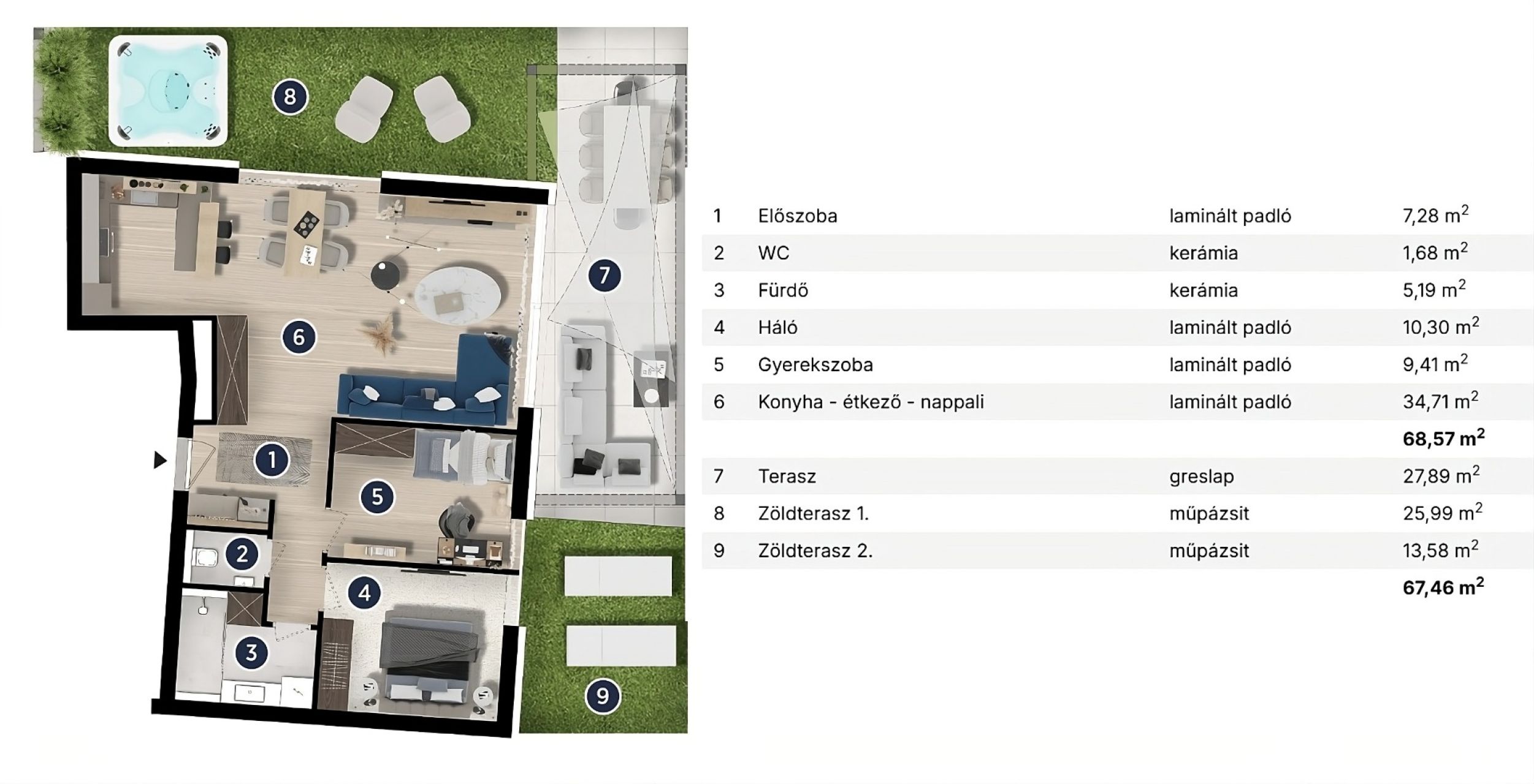 - Legfelső szinti penthouse lakások: tágas tetőteraszokkal, napvitorlával árnyékolva vagy igény szerint végleges fedéssel, valamint jakuzzi kialakítási lehetőséggel